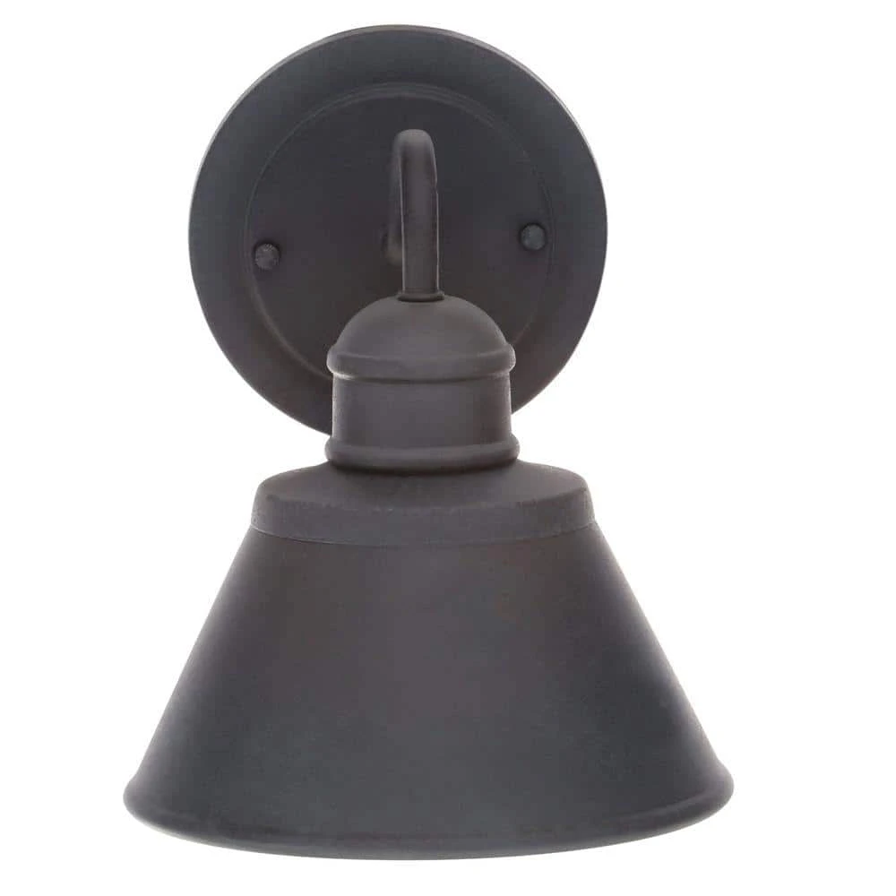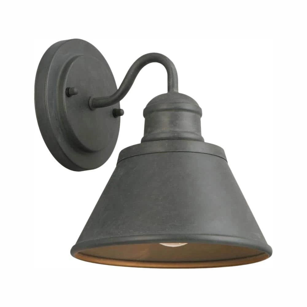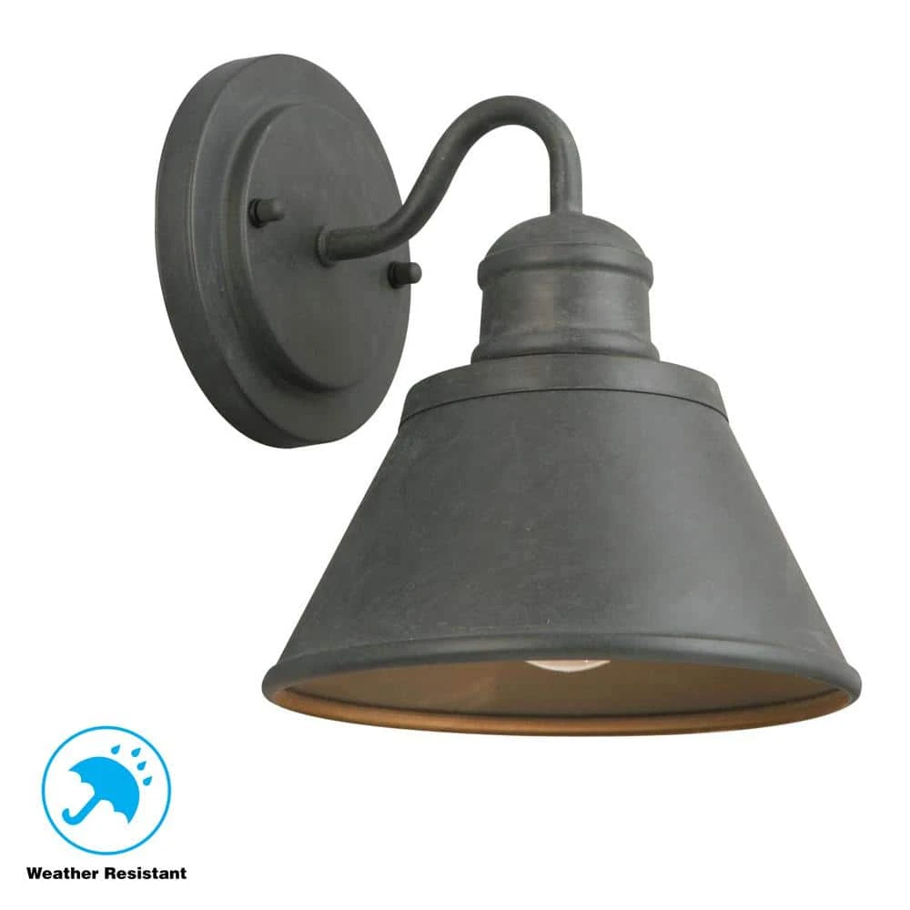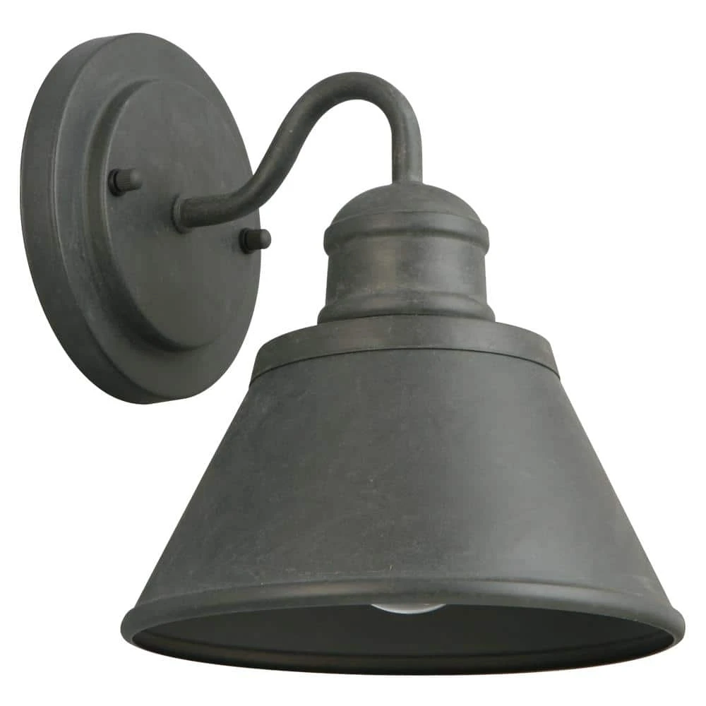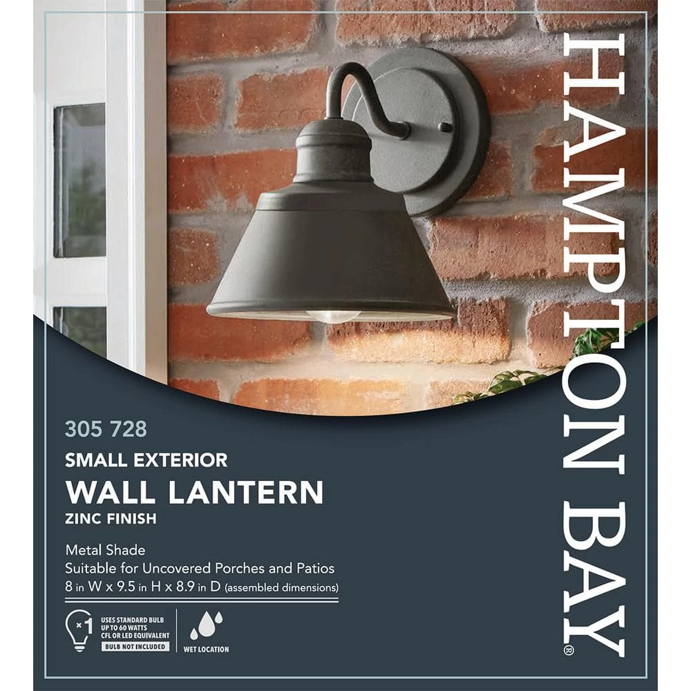 The Hampton Bay 1-Light Outdoor Zinc Barn Light Wall Lantern is designed with an aged look that will enrich your home. Hand-painted in zinc and lightly stained, the lantern offers illuminating ambiance to a given outdoor area. Uses 1-60-Watt medium base bulb or CFL equivalent (not included).