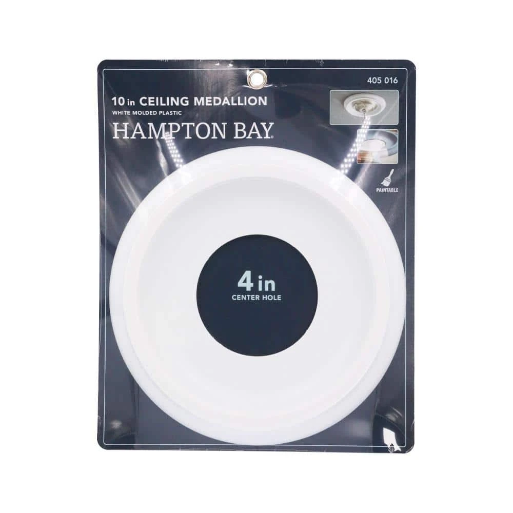 This 10 in. Smooth White Finish Ceiling Medallion offers a versatile, easily installed backdrop for any ceiling fan or lighting fixture. The medallion features a streamlined, contemporary design that will complement your existing molding or woodwork. The simple installation of this medallion is a great way to hide a hole if an opening in the ceiling is cut too large. It can also hide ceiling blemishes and cracks that may appear around ceiling fans and lighting fixtures. The medallion is 10 in. Dia with a 4 in. center opening and is made of durable molded plastic.