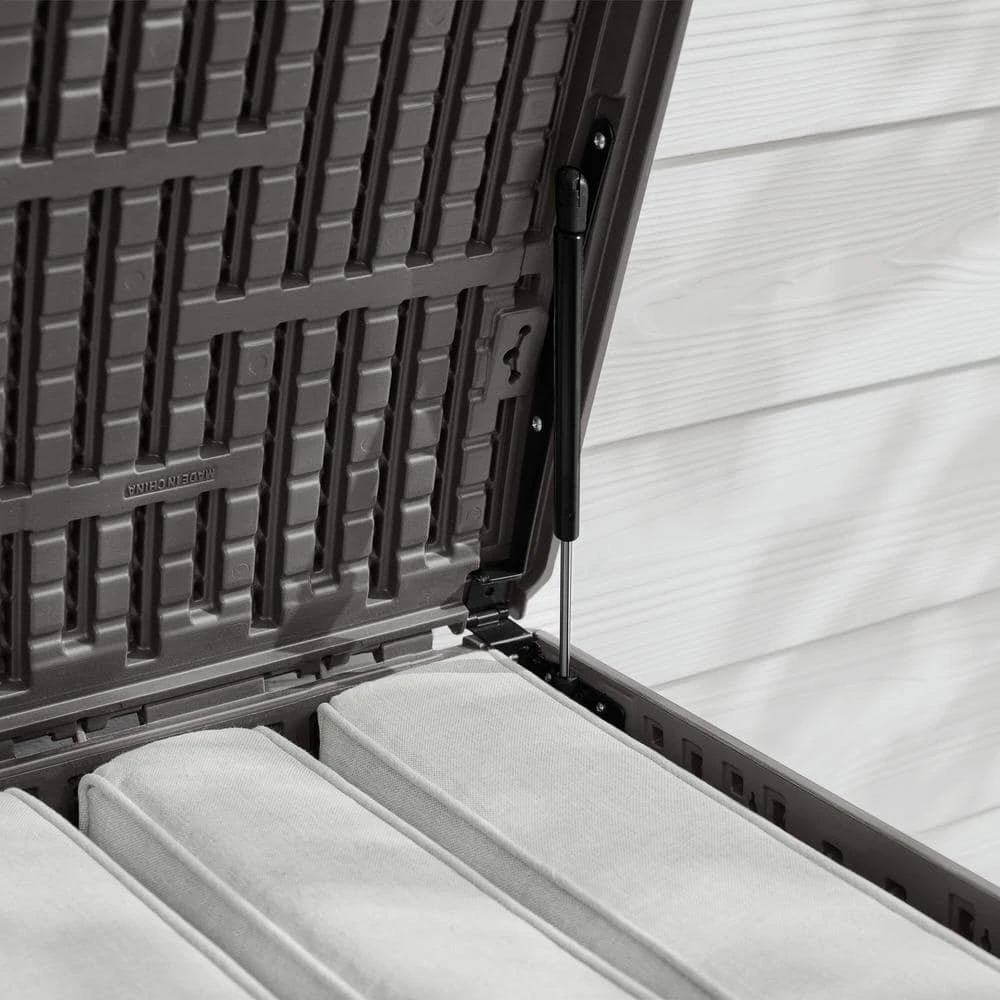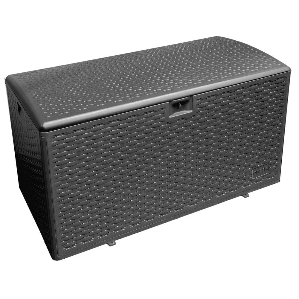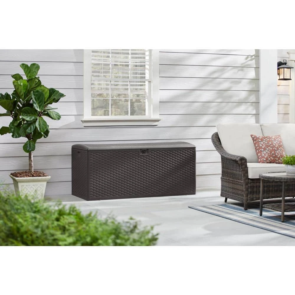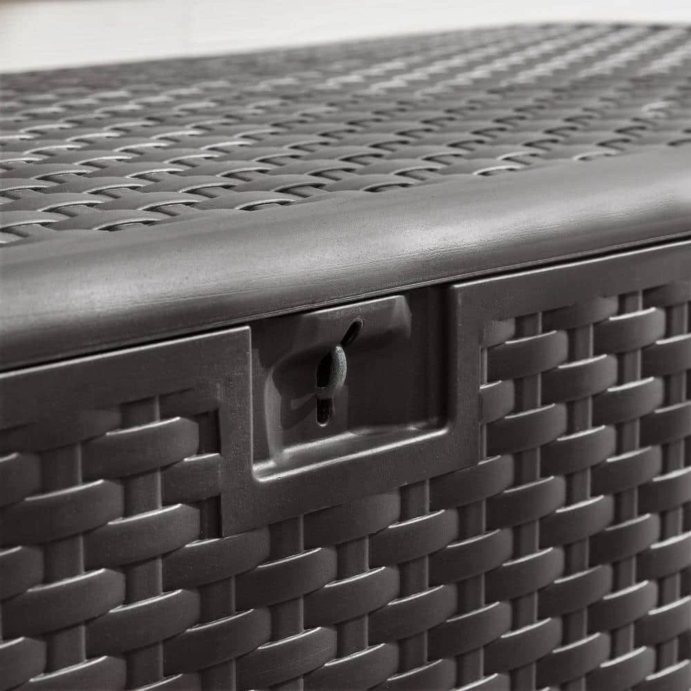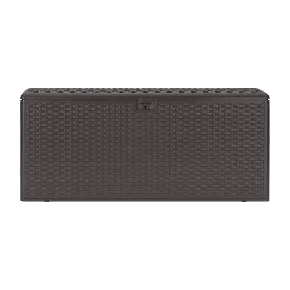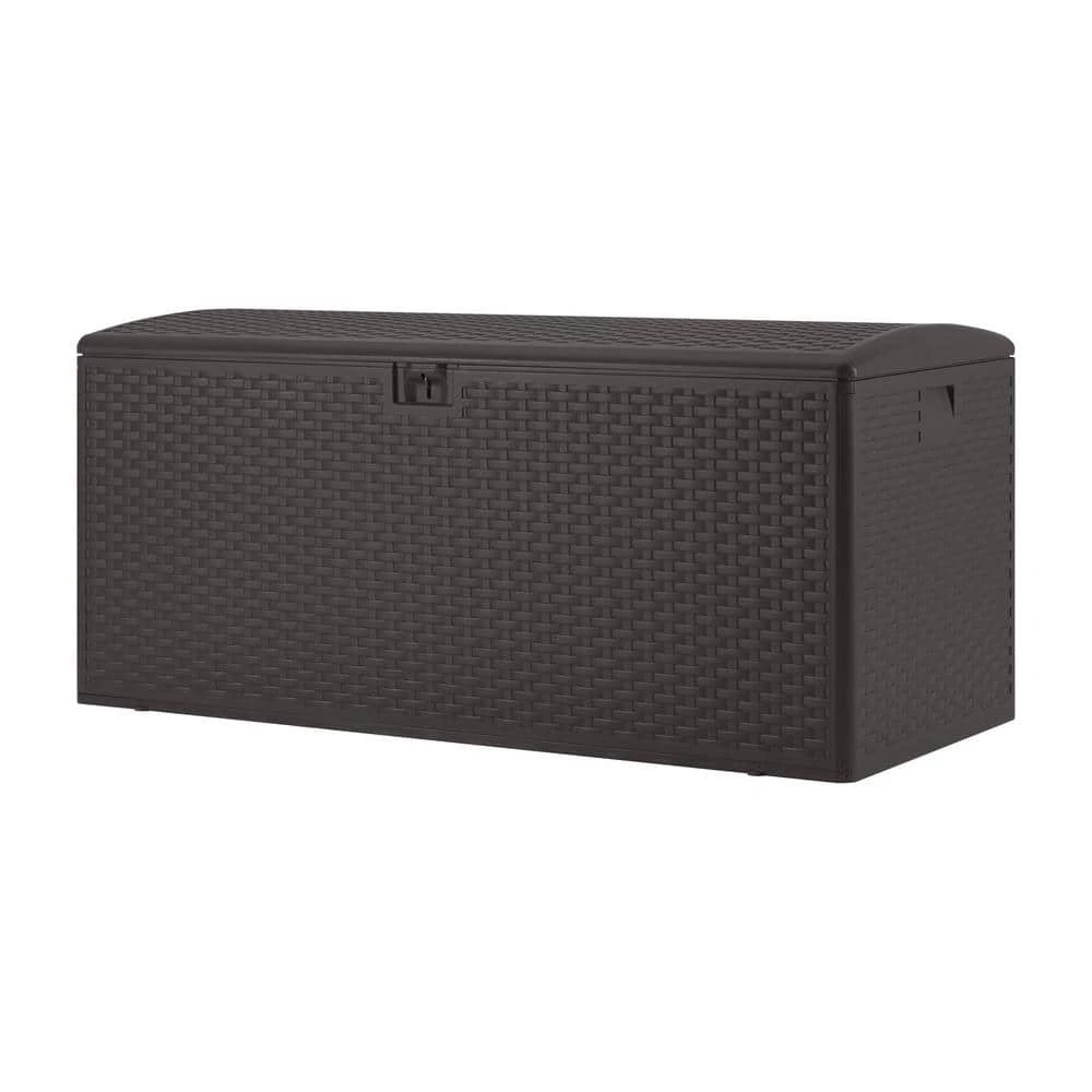Keep summer fun items close by in this amazing deck box. It features a lovely java brown hue, making this resin wicker deck box a stylish addition on a patio, deck or porch. Large interior cabinet is perfect for storing outdoor pillows, seat pads, swim gear and more.