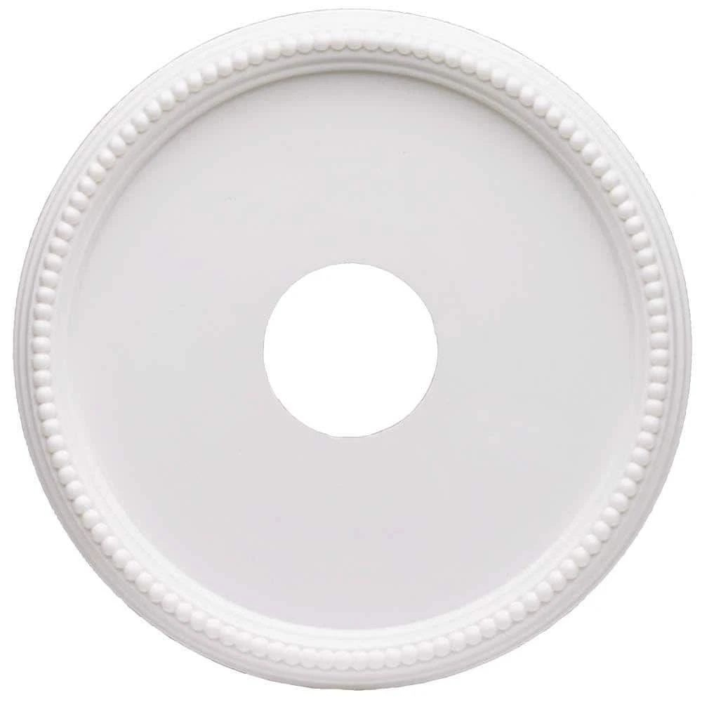 This 16 in. Beaded White Finish Ceiling Medallion offers an understated backdrop for your ceiling fans and fixtures. The bordered medallion features round beaded white surface that goes with any decor. The simple installation of this medallion is a great way to hide a hole if an opening in the ceiling is cut too large. It can also hide ceiling blemishes and cracks that may appear around ceiling fans and lighting fixtures. The medallion is 16 in. Dia with a 4 in. center opening. It is made of durable molded plastic. WARNING: To avoid the risk of fire, all light bulbs or any heat generating source should be at least 6 in. from this medallion.