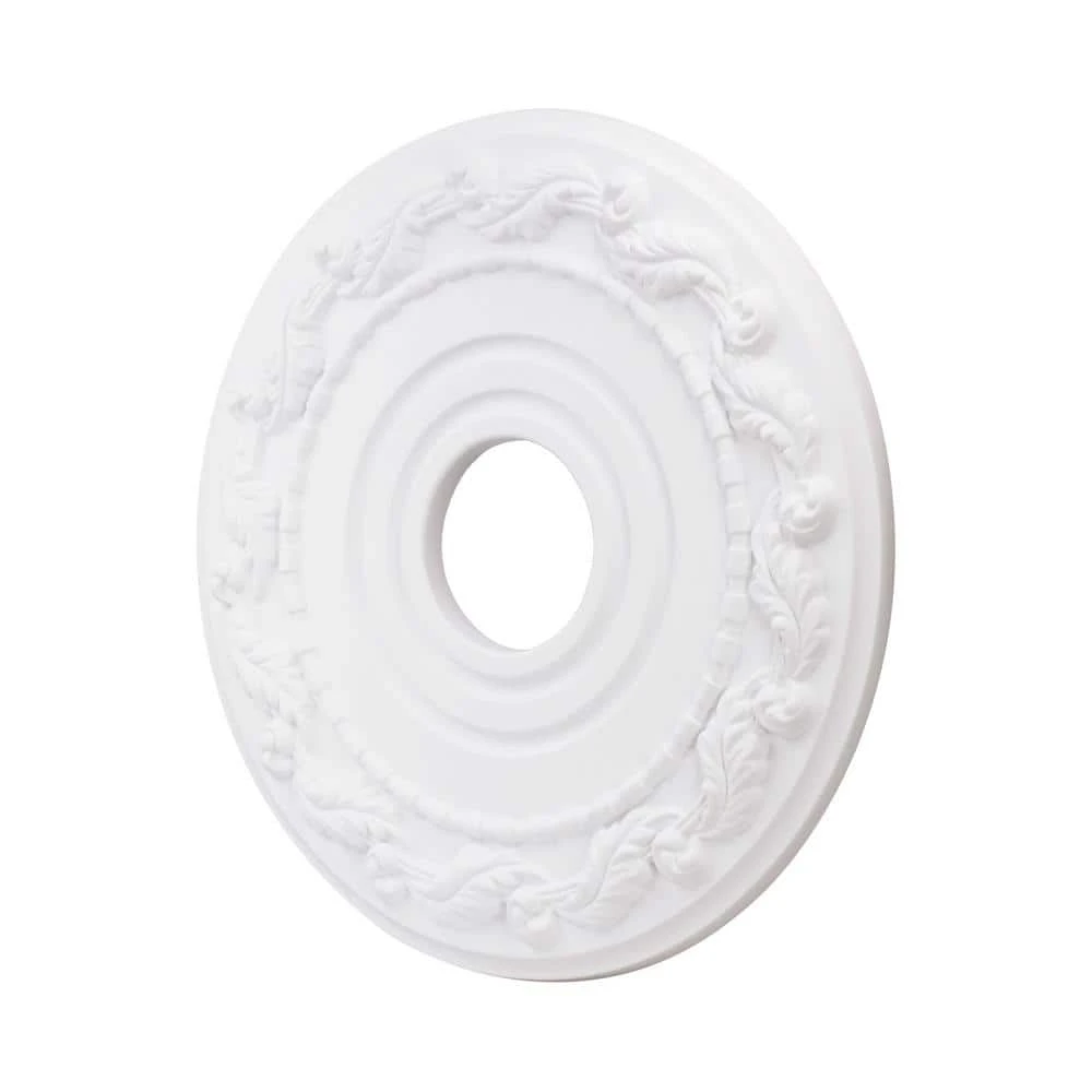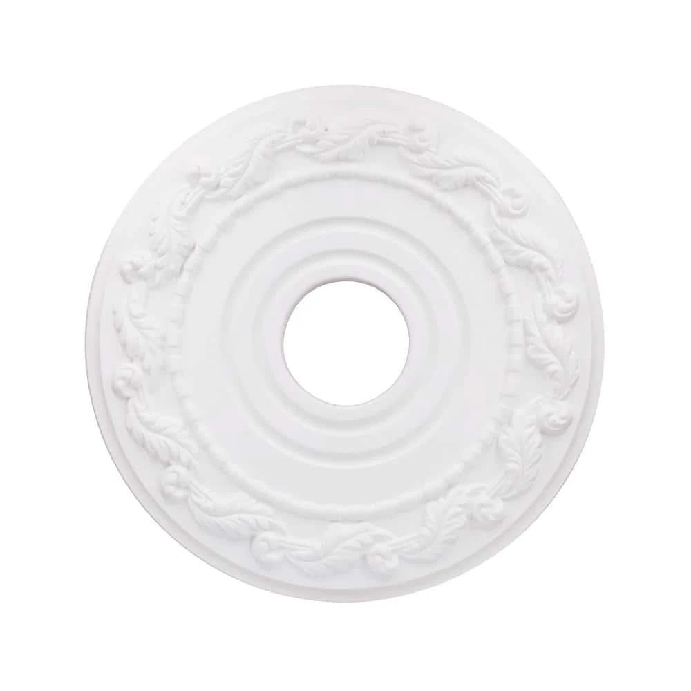 This 16 in. Decorative White White Finish Ceiling Medallion offers a classic backdrop for your ceiling fans and fixtures. The bordered medallion features decorative details on a white surface that goes with any decor. The simple installation of this medallion is a great way to hide a hole if an opening in the ceiling is cut too large. It can also hide ceiling blemishes and cracks that may appear around ceiling fans and lighting fixtures. The medallion is 16 in. Dia with a 4 in. center opening. It is made of durable molded plastic. WARNING: To avoid the risk of fire, all light bulbs or any heat generating source should be at least 6 in. from this medallion.