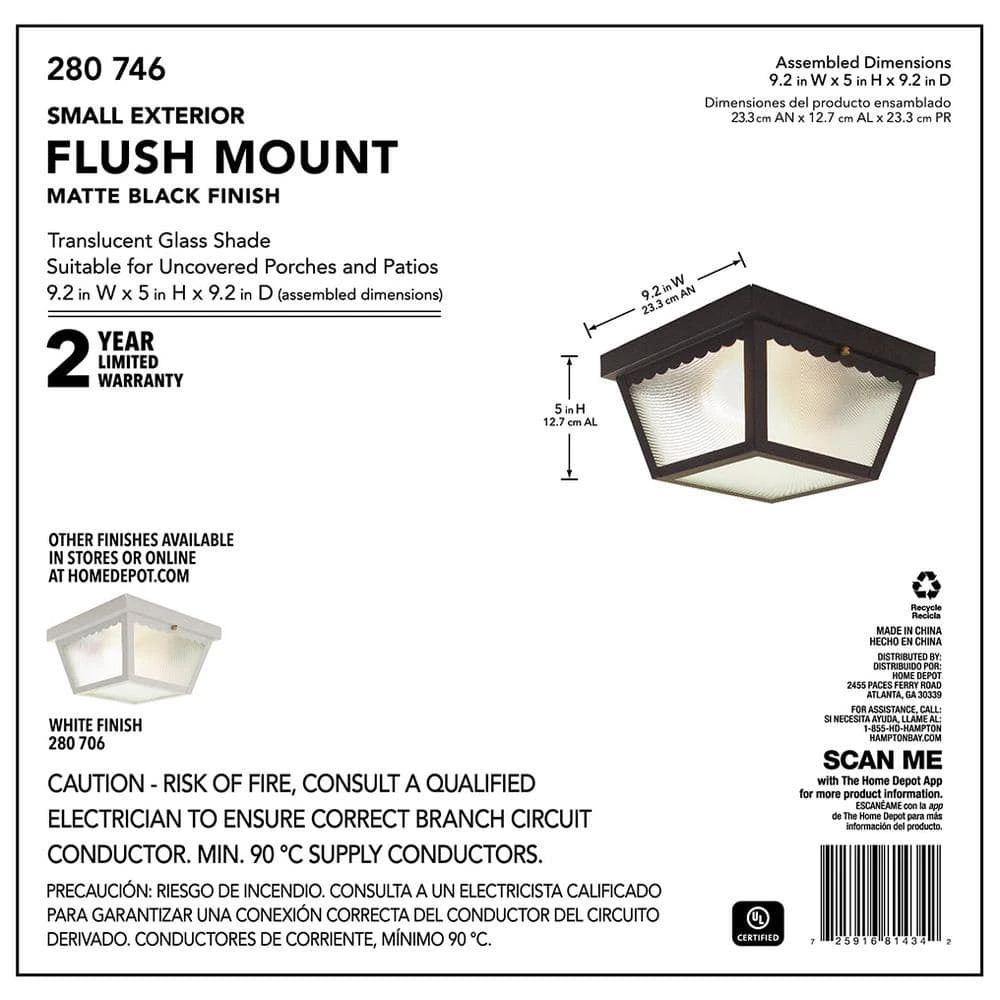 The Hampton Bay 2-light Matte Black Ceiling Mount has a low profile and is ideal for the patio, basement or garage. The translucent glass panels help diffuse the light and are encased in a simple yet stylish black housing. Uses 2-60-Watt light bulbs (not included).