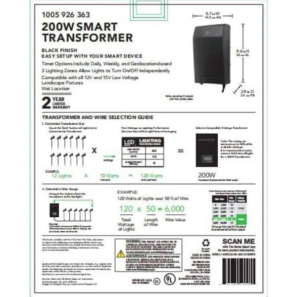 - 120V 200W HUBSPACE Low voltage landscape lighting Smart transformer with three channel output for selectable zone control and selectable 12Vac or 15Vac using any handheld iOS or Android mobile device together with The HOME DEPOT HUBSPACE APP