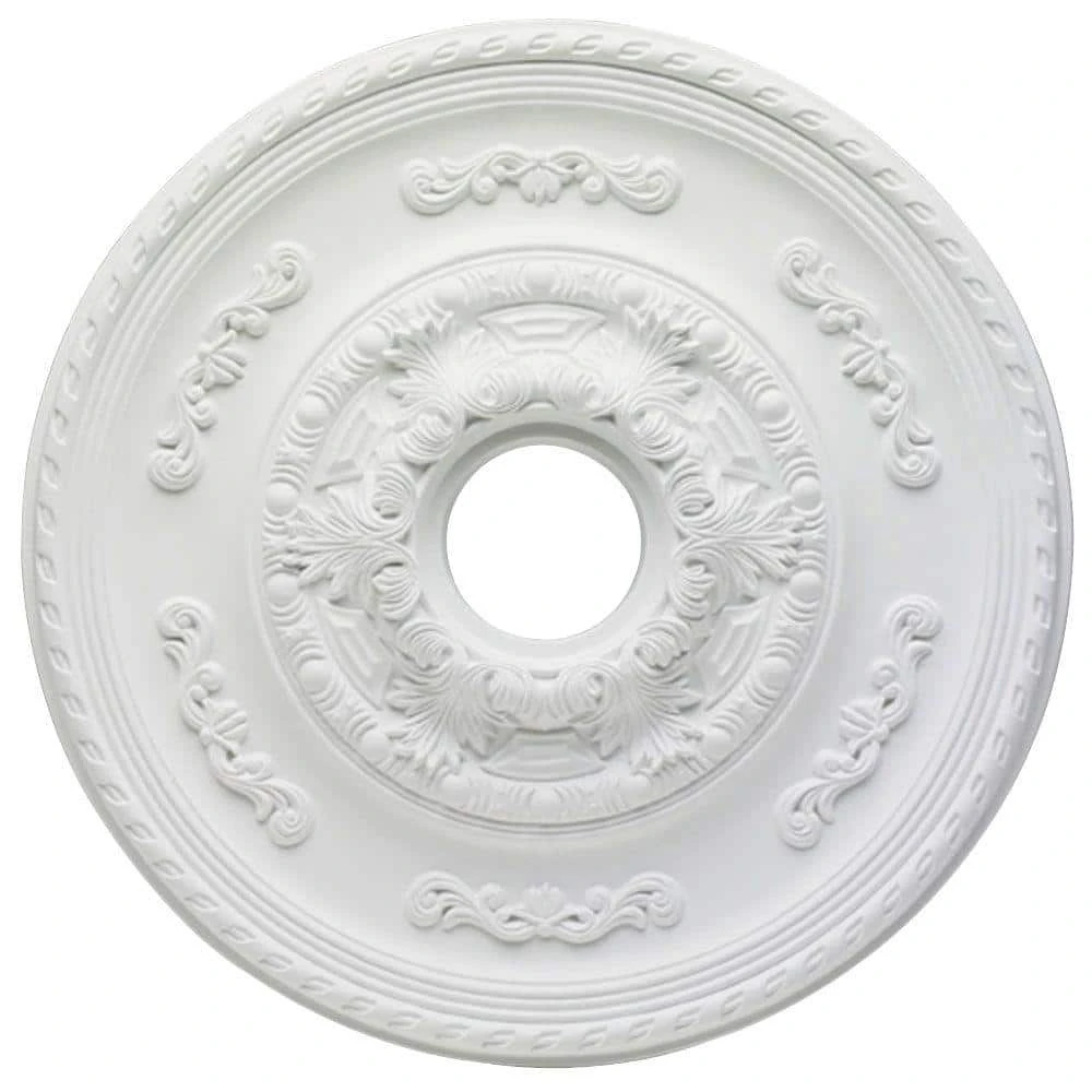The 21 in. White Finish Sofia Medallion is beautifully detailed with billowy acanthus leaves in relief that complement well-known architectural molding. This medallion is a versatile work of art that can be mounted to the ceiling for a traditional decorative touch or hung on the wall as an elegant focal point. Customize with a paint color of your choice to highlight the details and match your home’s decor. The medallion is 21 in. in diameter with a 4 in. center opening. It is made of durable, lightweight polyurethane that will never warp, split or splinter. Simply apply adhesive and use the included screws to fasten the medallion to any surface.