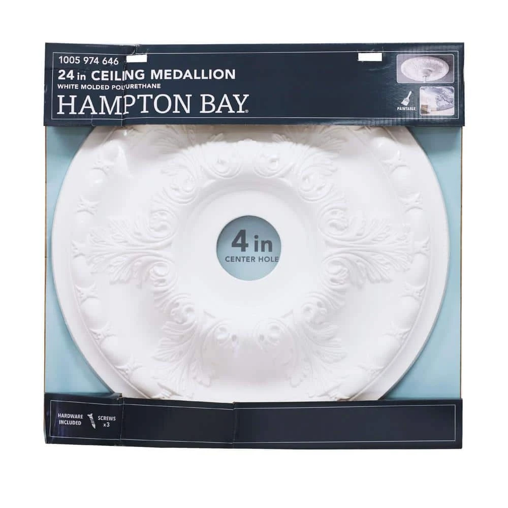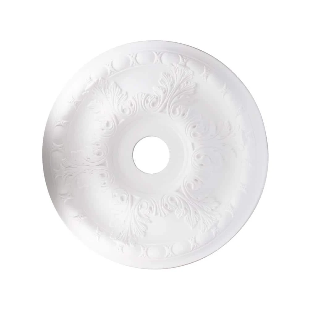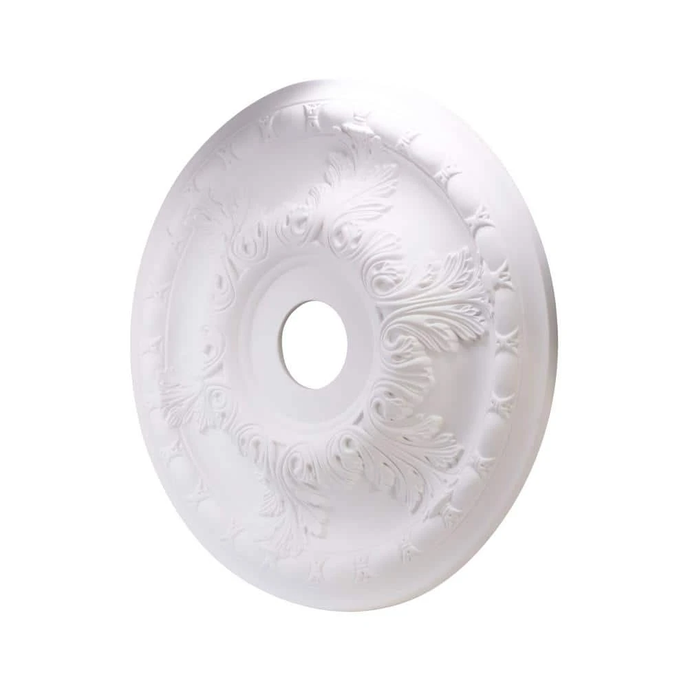 The 24 in. White Finish Decorative Medallion is beautifully detailed with billowy acanthus leaves in relief that complement well-known architectural molding. This medallion is a versatile work of art that can be mounted to the ceiling for a traditional decorative touch or hung on the wall as an elegant focal point. Customize with a paint color of your choice to highlight the details and match your home’s decor. The medallion is 24 in. in diameter with a 4 in. center opening. It is made of durable, lightweight polyurethane that will never warp, split or splinter. Simply apply adhesive and use the included screws to fasten the medallion to any surface.