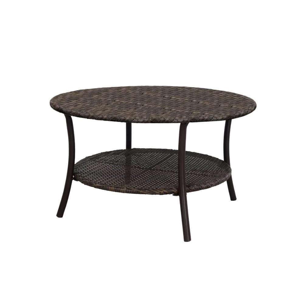 Add this Mix and Match 32 in. Brown All-Weather Wicker Round Coffee Table to your patio, porch or sunroom. Functional yet fashionable, use this stylish table to place snacks, refreshing drinks or reading material. The sturdy, rust-resistant steel frame is designed for all seasons of outdoor use and the multi-tone brown wicker finish offers a sophisticated look as you enjoy your surroundings.