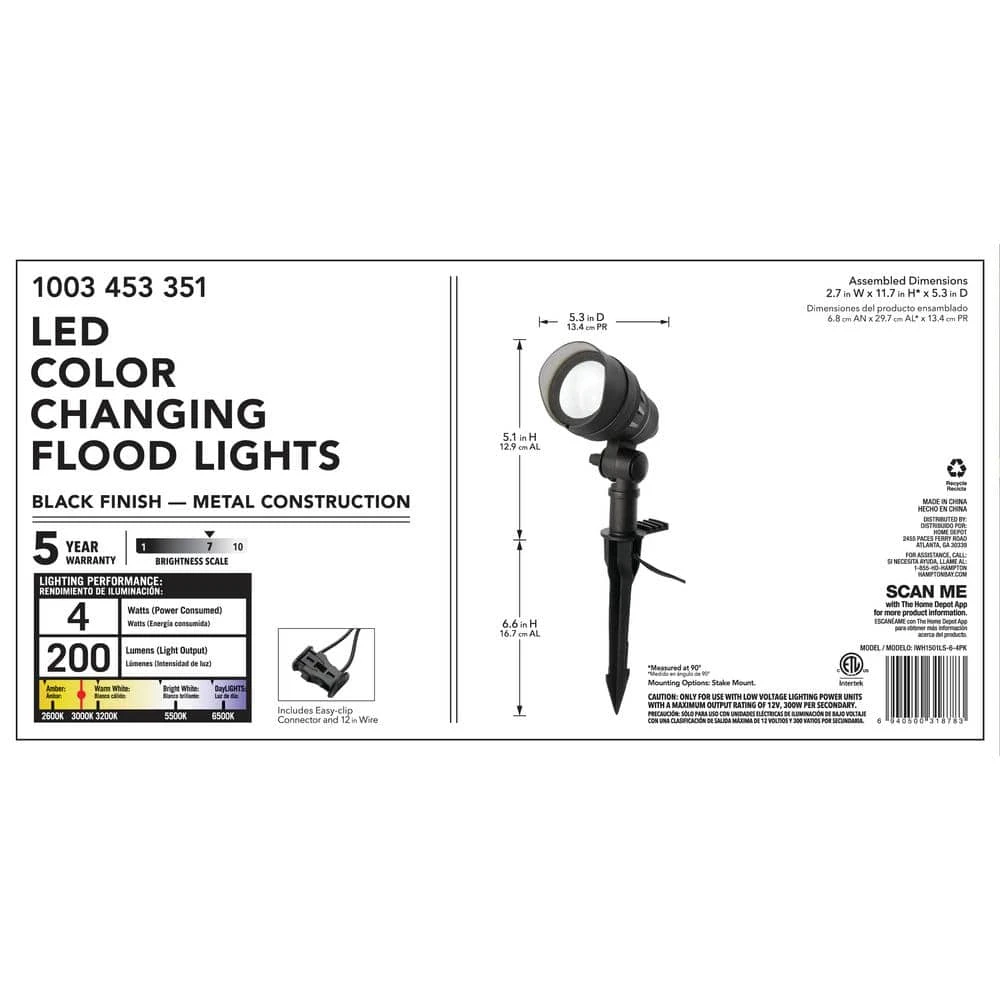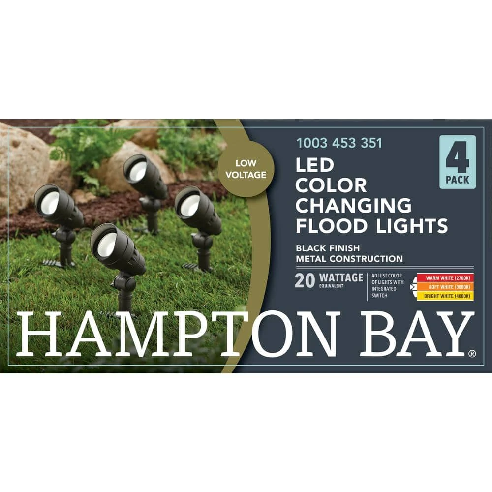 Each of the Hampton Bay Low Voltage 20-Watt Equivalent LED Flood Light (4-pack) offers the option of three light colors. The integrated switch rotates to choose from 2700K Warm White, 3000K Soft White or 4000K Daylight light color. The flood beam angle is perfect for highlighting wide areas, as well as enhancing home security. On any of the 3 light color settings, it consumes over 80% less energy than a typical halogen light and has a rated life of 50,000 hours. The LED system provides maintenance free operation and there are no bulbs to change. With cast aluminum construction, long life powder coat finish and weatherproof electronics, you can count on many years of service. The quick-install wire connector means easy do-it-yourself installation that is quick and safe.