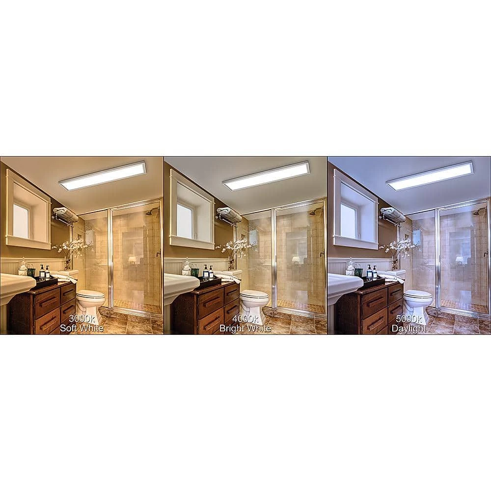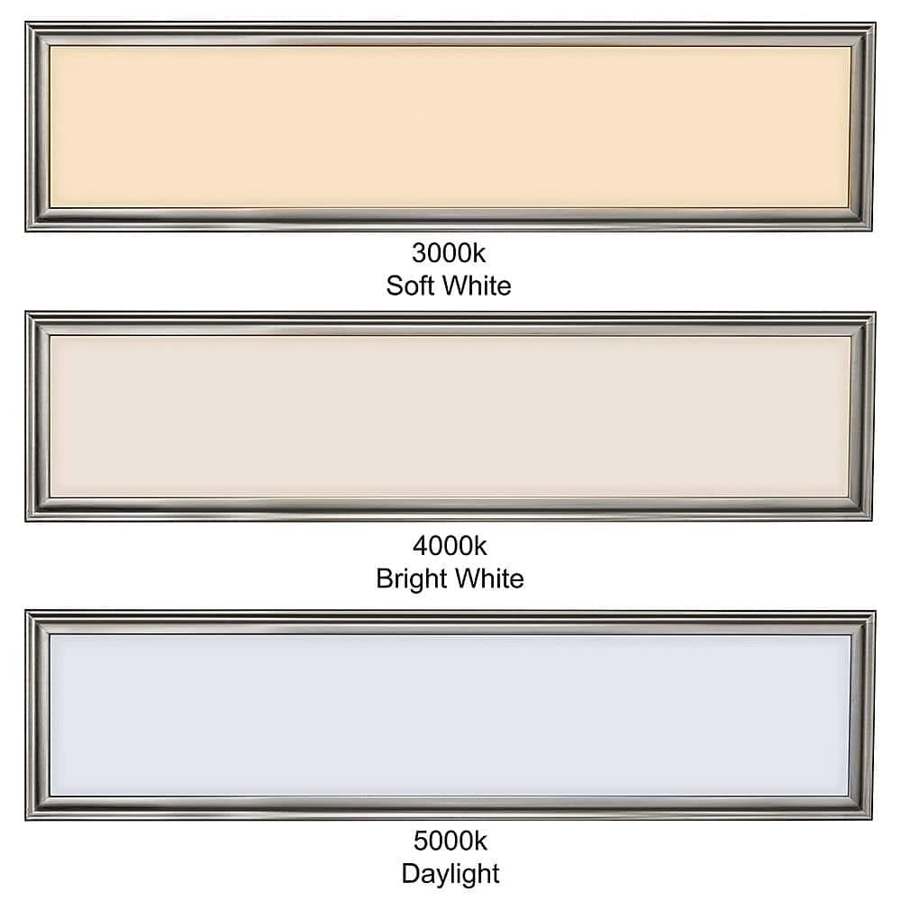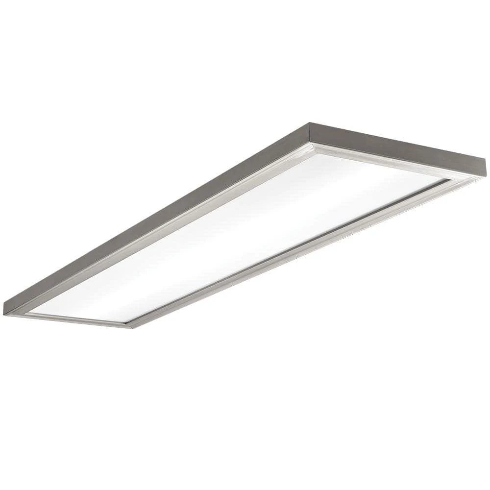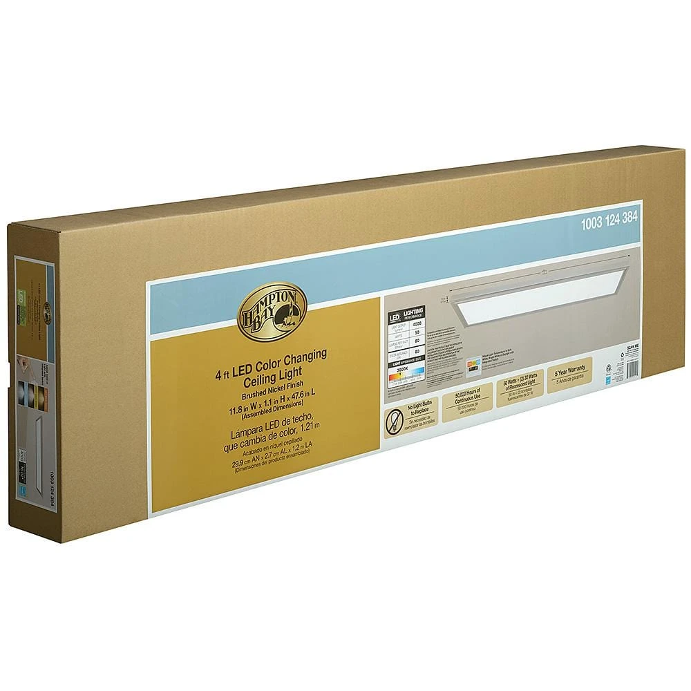 Hampton Bay 4ft. Low Profile Brushed Nickel LED Rectangular Light Fixture is a Contemporary fixture designed to replace outdated fluorescent lights into an energy-efficient LED fixture. Prior to installation, you choose between 3 color temperatures of light output: Soft White, Bright White or Daylight using slide switch on the side of the fixture. It provides crystal-clear illumination with no yellowing, discoloration or darks spots over time. This fixture delivers a superior light engine lasting up to 50,000 hours continuous use ensuring maintenance free service with no need to replace any tubes. Ideal for kitchen, laundry room, bathroom, bedroom, basement, office, corridors/hallways and retail spaces.