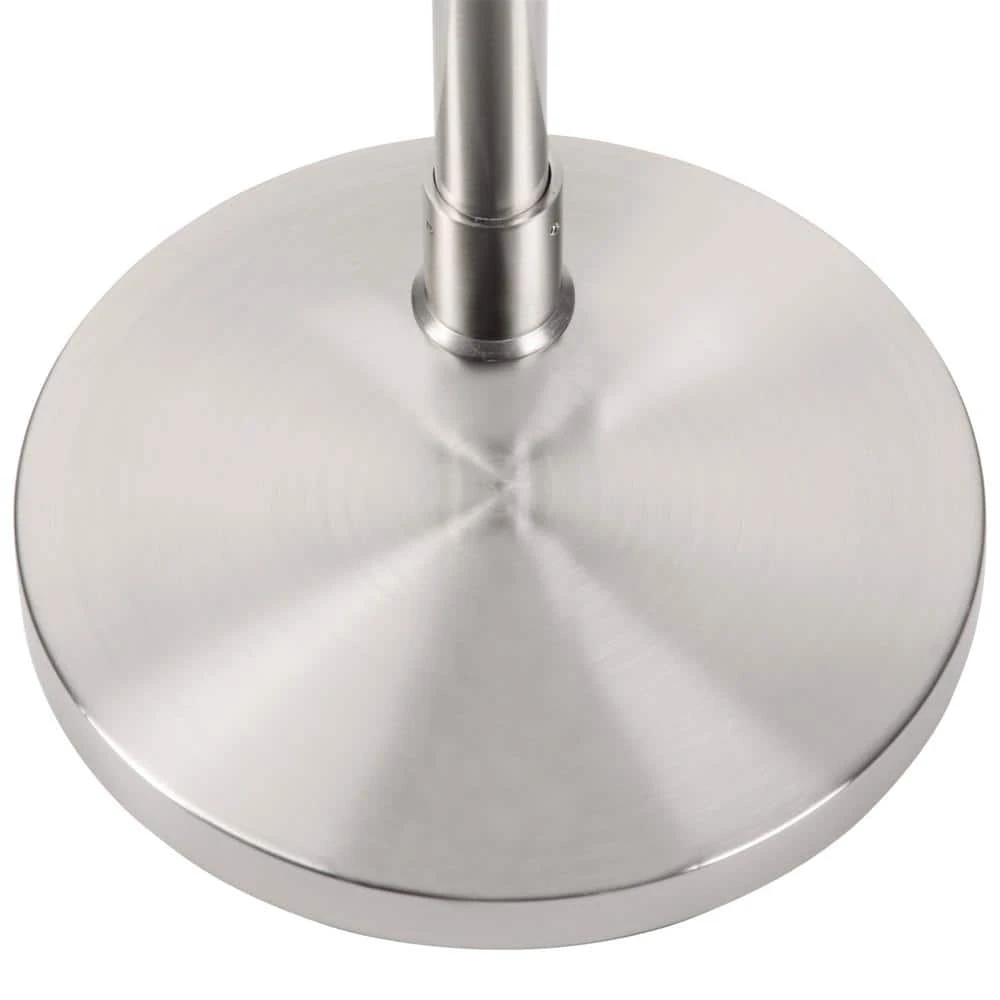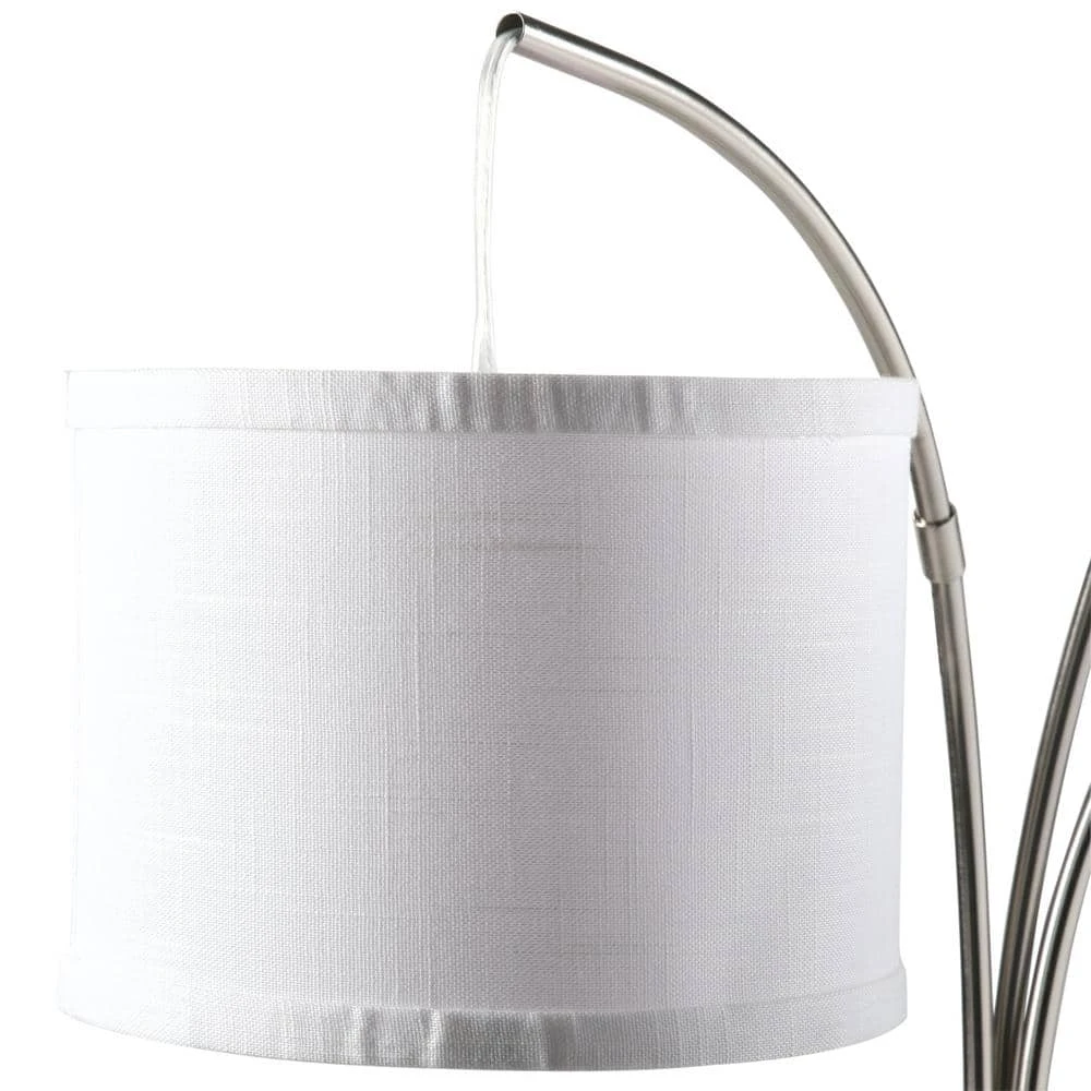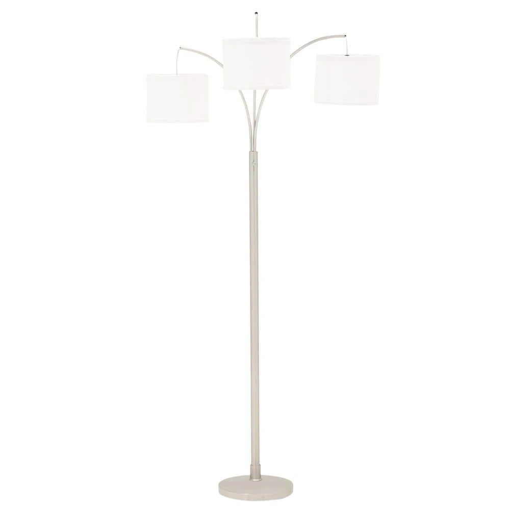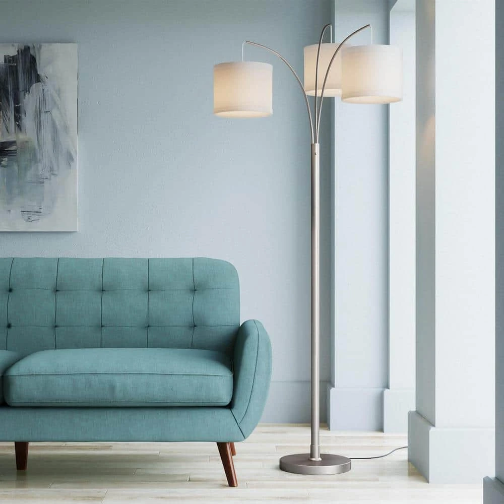 This brushed nickel floor lamp has 3 linen drum shades which suspend from adjustable curved metal poles. It has a rotary switch on the pole and uses three 60-Watt incandescent bulbs or CFL or LED equivalent (not included). It is 80 in. H. This lamp will brighten up any room decor in the house.
