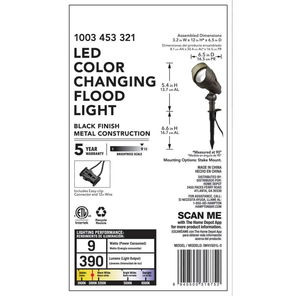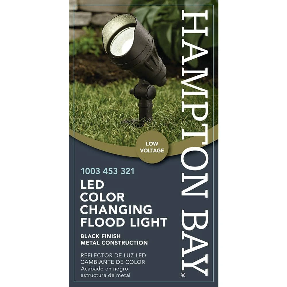 The Hampton Bay Low Voltage 50-Watt Equivalent LED Flood Light offers the option of three light colors. The integrated switch rotates to choose from 2700K Warm White, 3000K Soft White or 4000K Daylight light color. The flood beam angle is perfect for highlighting wide areas, as well as enhancing home security. On any of the 3 light color settings, it consumes over 80% less energy than a typical halogen light and has a rated life of 50,000 hours. The LED system provides maintenance free operation and there are no bulbs to change. With cast aluminum construction, long life powder coat finish and weatherproof electronics, you can count on many years of service. The quick-install wire connector means easy do-it-yourself installation that is quick and safe.