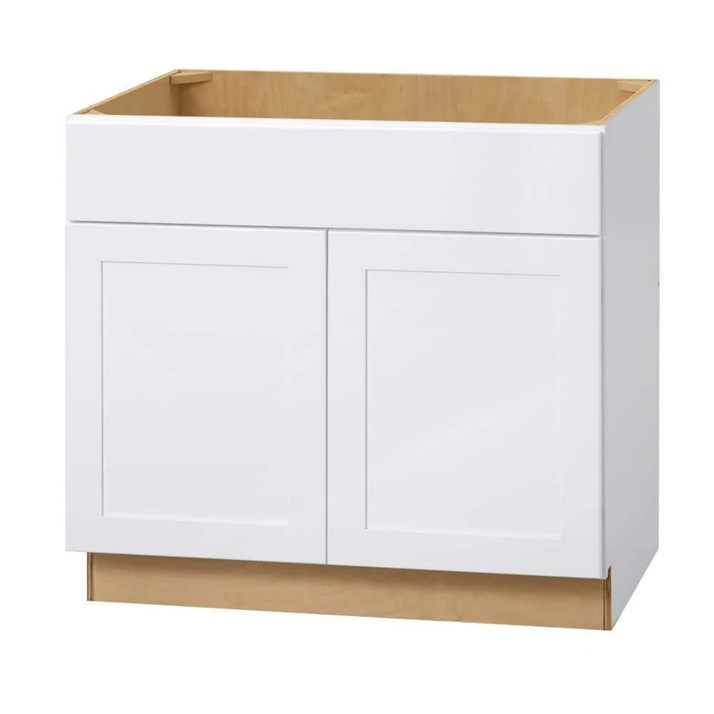 Give your dishwashing station a perfect finishing touch with this Hampton Bay Avondale Shaker Quick Assemble sink base cabinet. The thoughtful design offers space at the top for your choice of sink, and the open design underneath accommodates plumbing fixtures for a seamless fit. This cabinet boasts shaker-style doors and a premium painted alpine white finish, bringing classic style and a bright look to your space. Made of durable plywood, which adds strength while reducing weight for easier installation. This Hampton Bay Avondale Shaker sink base cabinet with Quick Assemble Ready to Assemble technology, can be assembled up to 1.5x faster than the competition, making your remodel seamless!