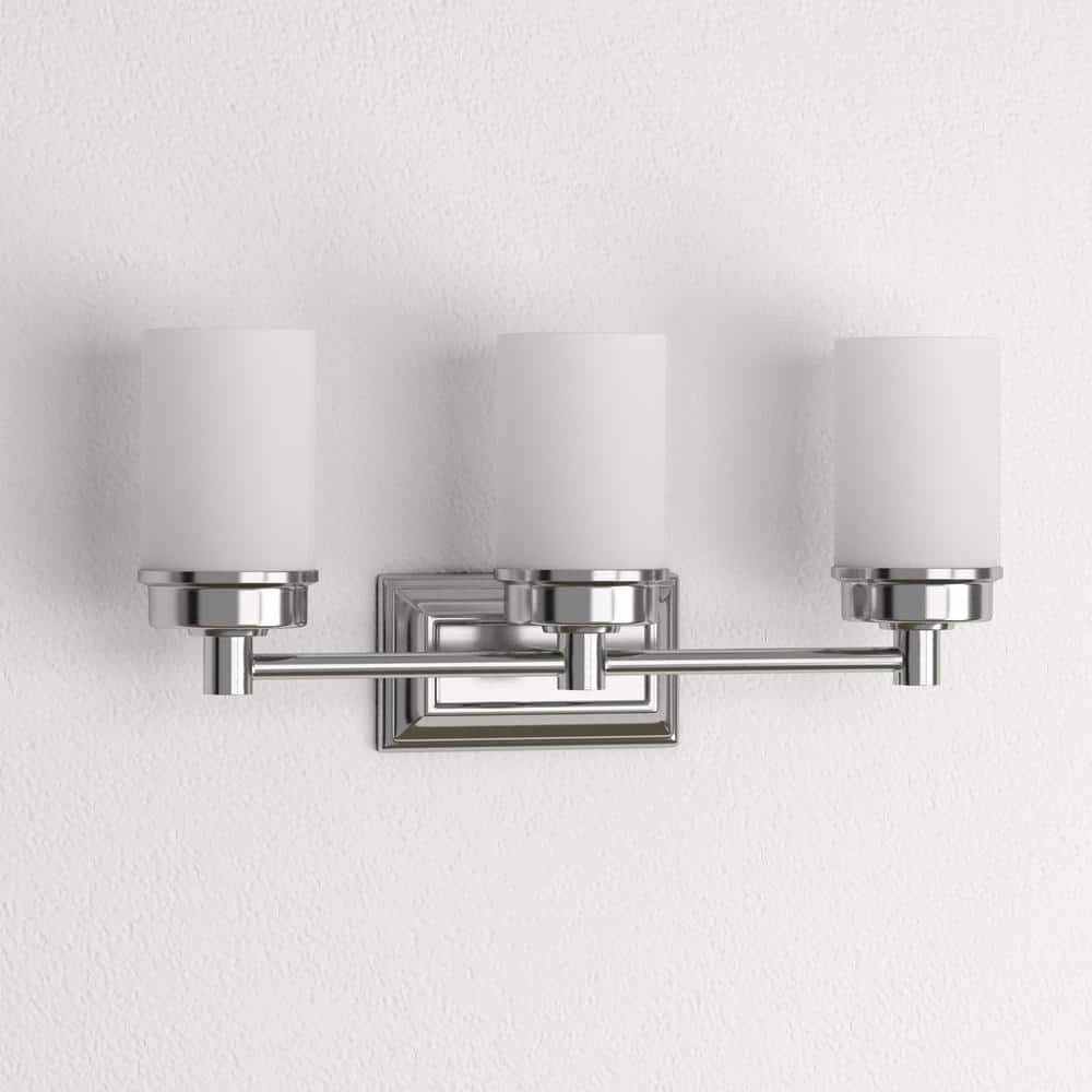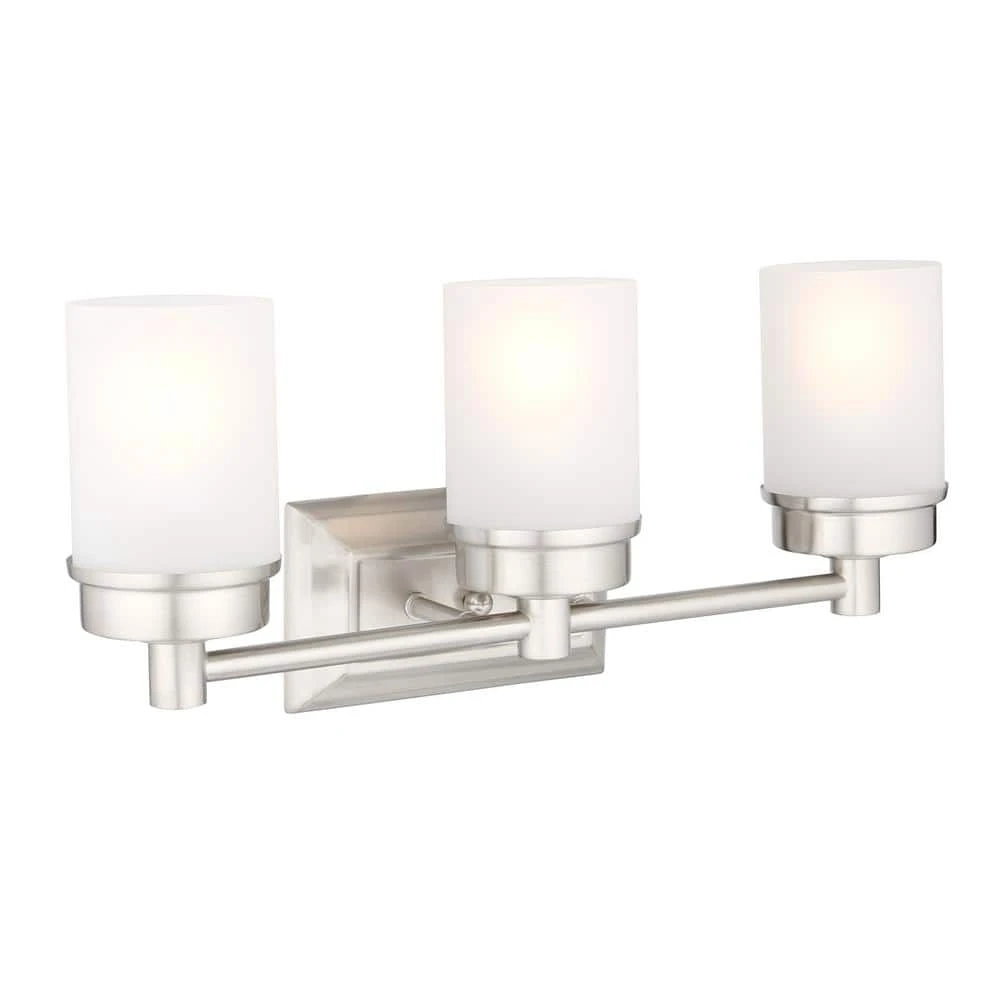 The Hampton Bay Cade Collection exhibits transitional style vanity lighting that will upgrade your bathroom or powder room with elegant style. The Hampton Bay Cade 20.25 inch bathroom vanity light in brushed nickel uses three 60-watt bulbs, each of which is shaded by white frosted glass. The white glass is complimented by a classic, brushed nickel finish that will easily coordinate with existing bathroom styles. The cylindrical shaped shades are open at the bottom, allowing access to change the bulbs. The shades are held in place by a straight arm connected to a rectangular backplate which features matching line detail present throughout the piece. This vanity light bar can be mounted with the shades facing upwards or downwards for a customizable look.