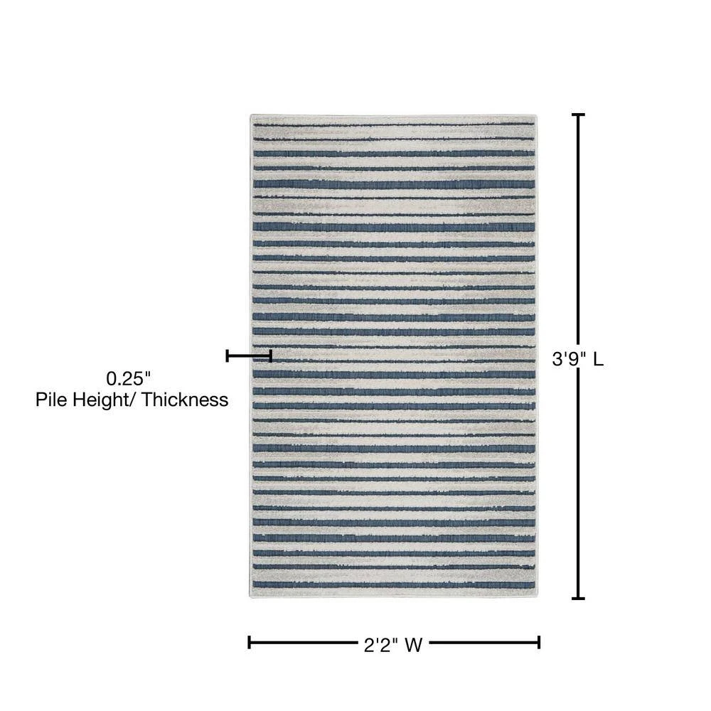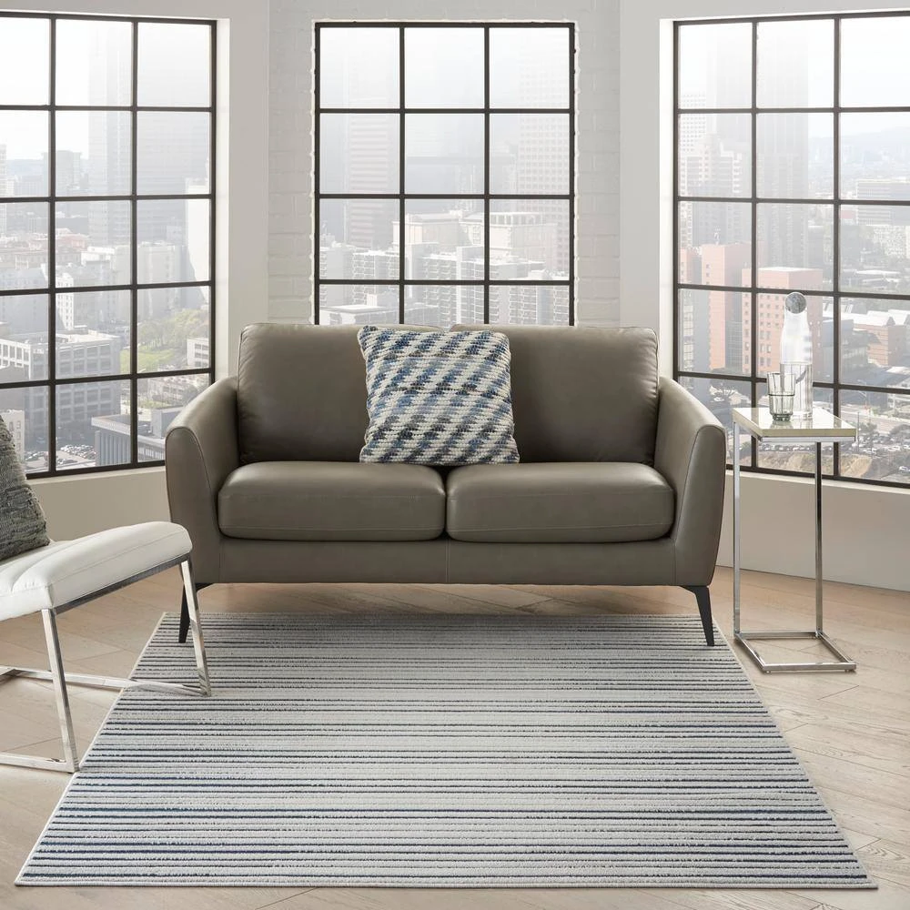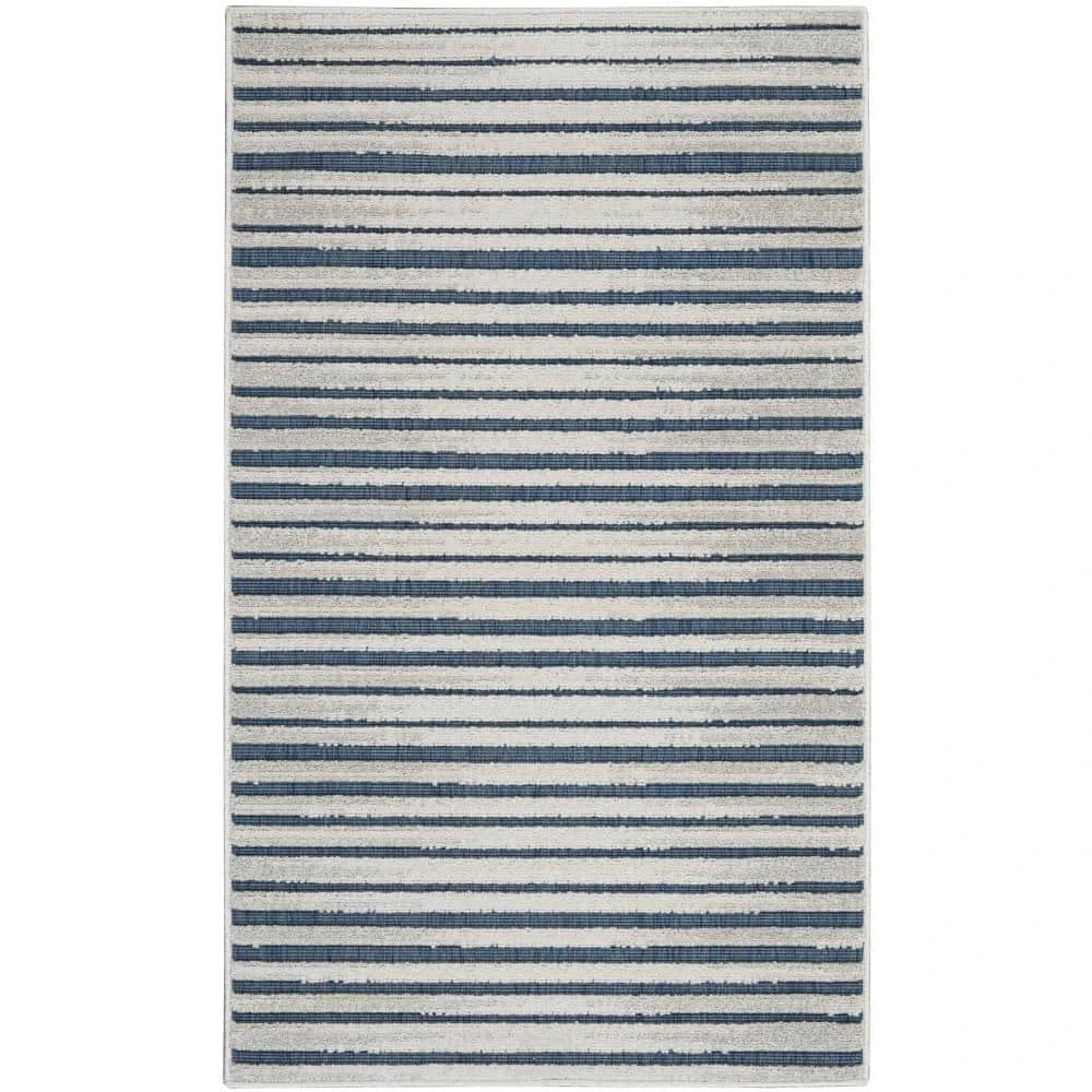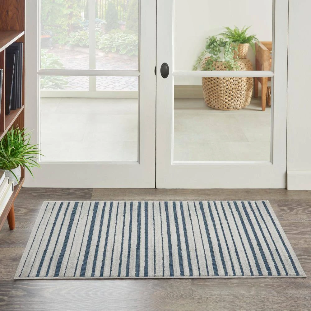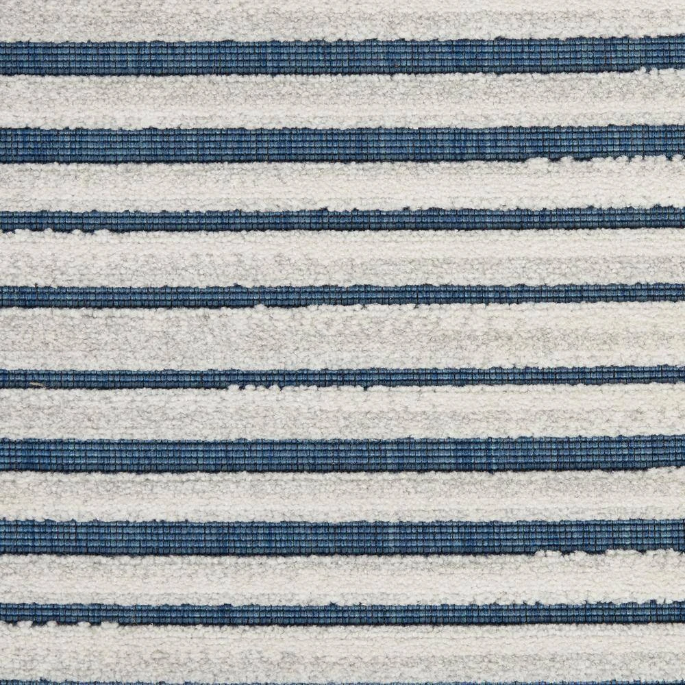 With a palette of rich blues, mysterious greys and smoky taupes, Calobra offers a fresh and sophisticated look in an indoor/outdoor rug collection. These easy-care, low-shed beauties have the special, textural touch of cut-and-loop pile, so unusual in a casual rug collection. They bring unexpected elegance to your poolside, patio, porch or balcony, and are ideal for your beach home or any indoor location. The contemporary and transitional designs are flat power-loomed of 60% polypropylene and 40% polyester, so you can vacuum or hose-rinse and air-dry them with minimum fuss and maximum style impact! The subtle, shape-shifting stripes of this Calobra design bring a fresh, contemporary look to your indoor or outdoor space. This versatile area rug looks as good in your favorite room as it does on a patio, porch or pool deck. Elegant in lagoon blue with the special touch of cut-and-loop pile in an easy-care poly-fiber blend.