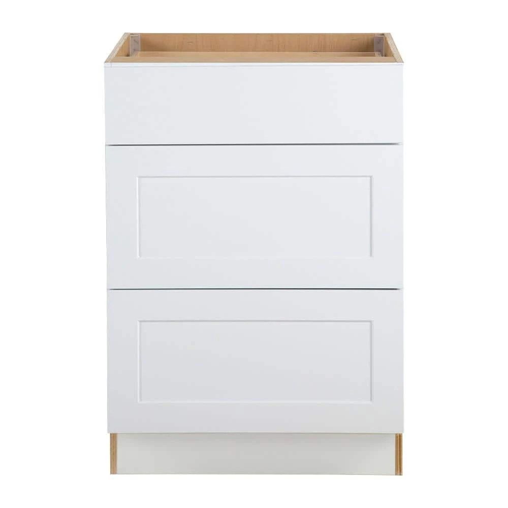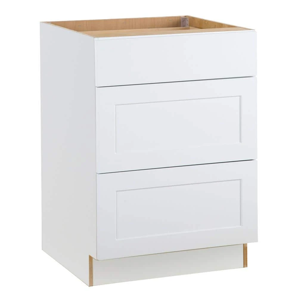 โGiving you that transitional/modern look that will be sure to evoke a chic presentation, the Cambridge 24 in. W assembled base cabinet is beautifully crafted with slab drawer front and shaker style RTF drawers. The Cambridge collection offers a brilliant, solid white complexion on an all plywood cabinet with a natural wood interior that is sure to add a touch of brilliance to any room. Including a full overlay door style, the base cabinet is fully assembled making it easy for you to build the kitchen, bathroom, laundry room or office of your dreams.