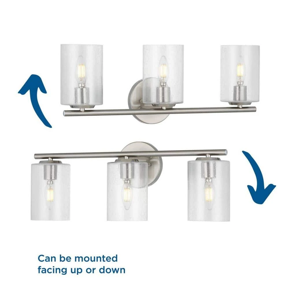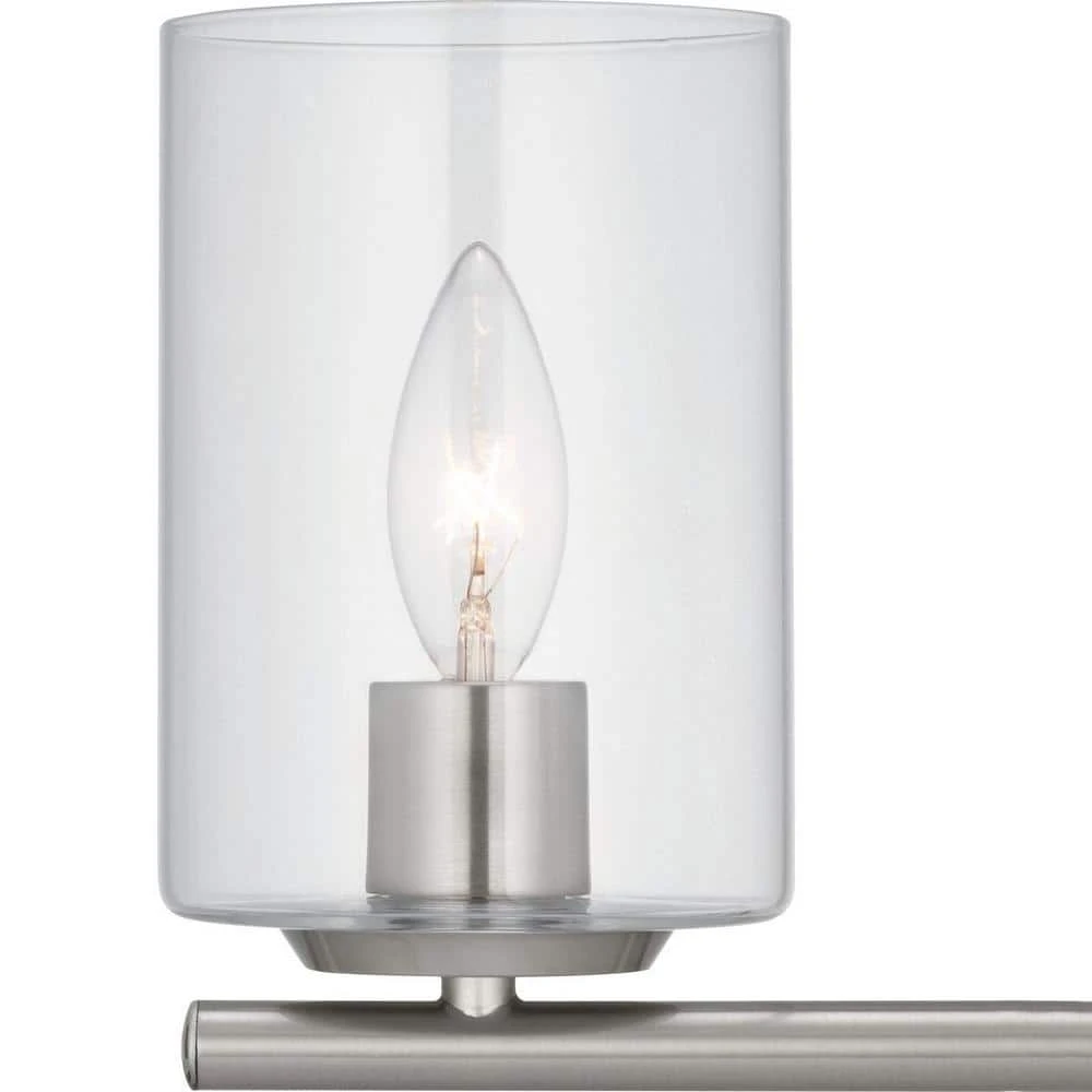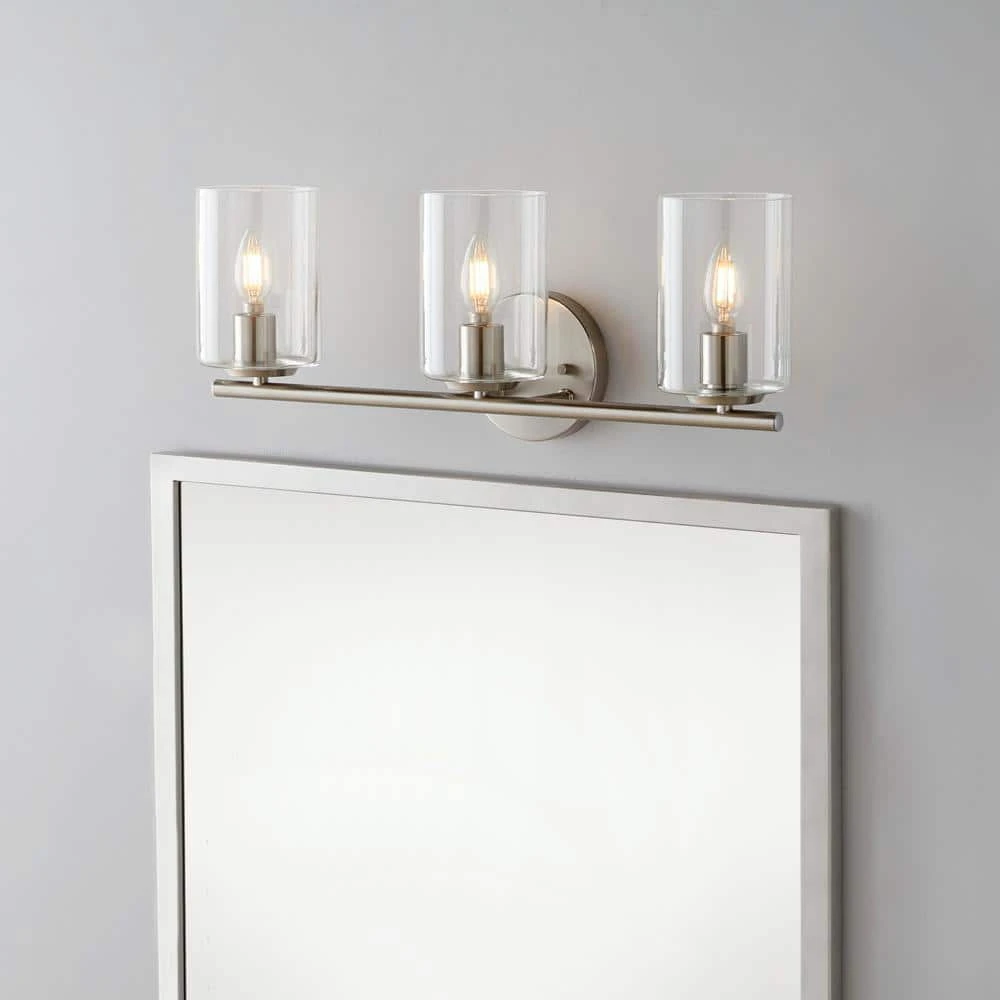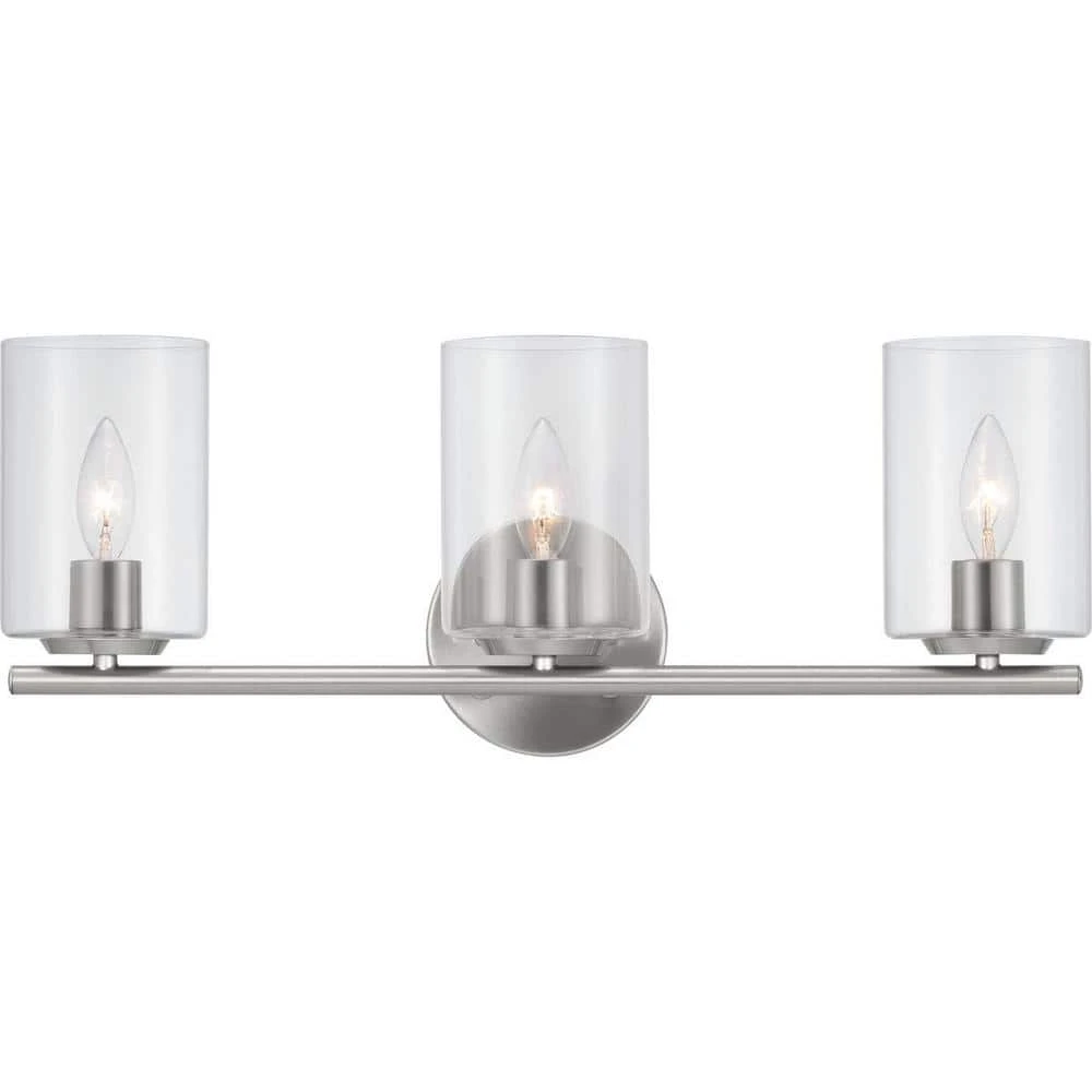 Instill in your bathroom the rejuvenating vibes of a world class spa with the Carabella 3-Light Brushed Nickel Bathroom Vanity Light. Stunning clear glass shades perch on simple light bases in a linear fashion. A single smooth bar holds the light bases in place and affixes to a sleek round backplate. The frame is coated in a beautiful brushed nickel finish that fosters a dream bathroom look.