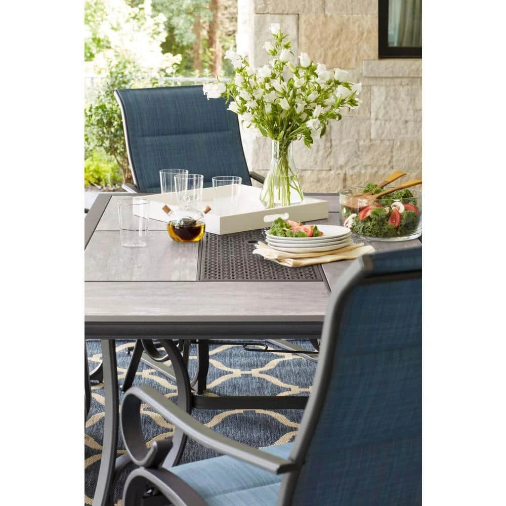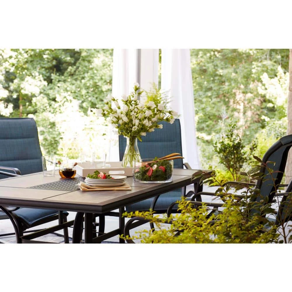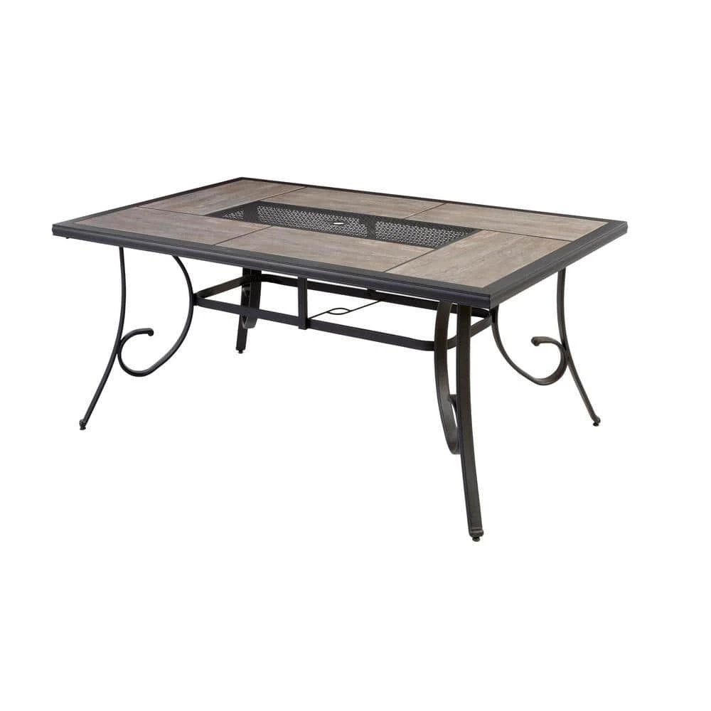 Dine outdoors in style with this Crestridge Rectangular Patio Dining Table. The steel frame adds durability and the charcoal brown, powder-coated finish is rust-resistant. The ceramic tile tabletop features a striking wood-pattern and complements most types of decor. This low maintenance table is easy to clean with gentle soap and warm water. Backed by a 2 year frame and fabric limited warranty.
