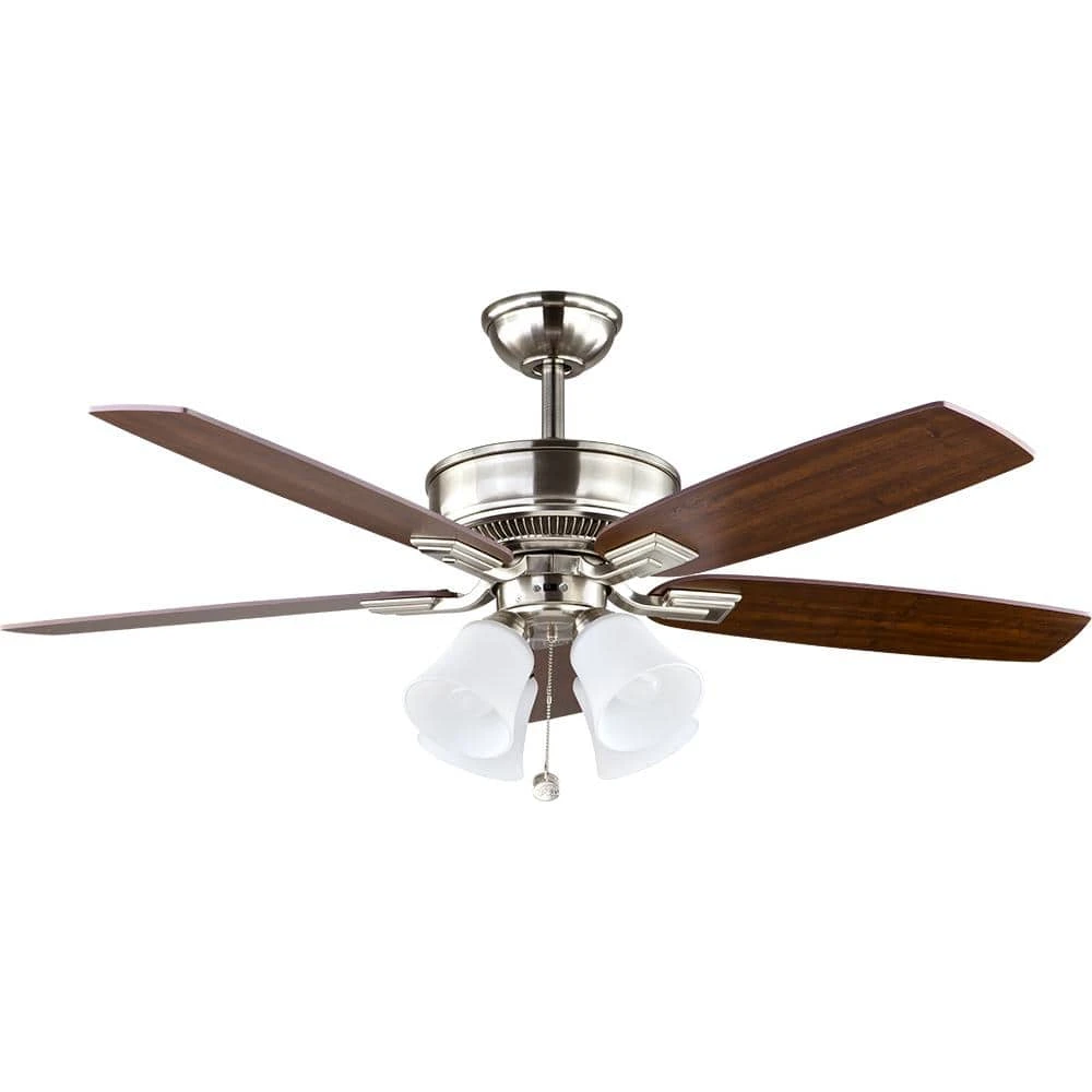 The Hampton Bay 52 in. Devron ceiling fan couples traditional elegance with design enhancements to deliver a fan that will look great for years to come. The Devron ceiling fan includes QuickFit features like a slide-on mounting bracket, QuickInstall blades, and AccuArm blade arms to make installation a breeze. The four-light light kit is designed for maximum illumination and includes four 9-Watt LED bulbs which last longer and use less energy than CFL or incandescent bulbs.