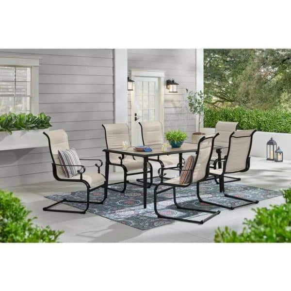Wind down in these Hampton Bay Glenridge Falls outdoor padded sling rocking dining chairs. The rocking design lets you easily sit back and enjoy the views, while the padded sling material creates a comfortable seat. Riverbed coloring complements a variety of outdoor decor styles. Made with reliable steel frames, these Hampton Bay Glenridge Falls outdoor padded sling rocking dining chairs effortlessly handle a wide range of weather conditions to support lasting outdoor use.