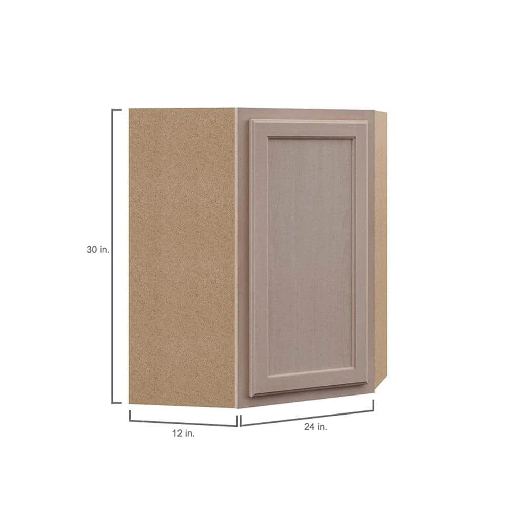 Add the classic style to your kitchen or bathroom with the 24 in. Corner Wall Cabinet. Hand assembled and made with wood, the cabinet’s door and face frames offer lasting beauty and performance. The cabinet’s maple interior is laminated for easy cleaning, while its unfinished exterior is ready for a coat of paint or stain. The cabinet has a single shelf that stores lots of household items.
