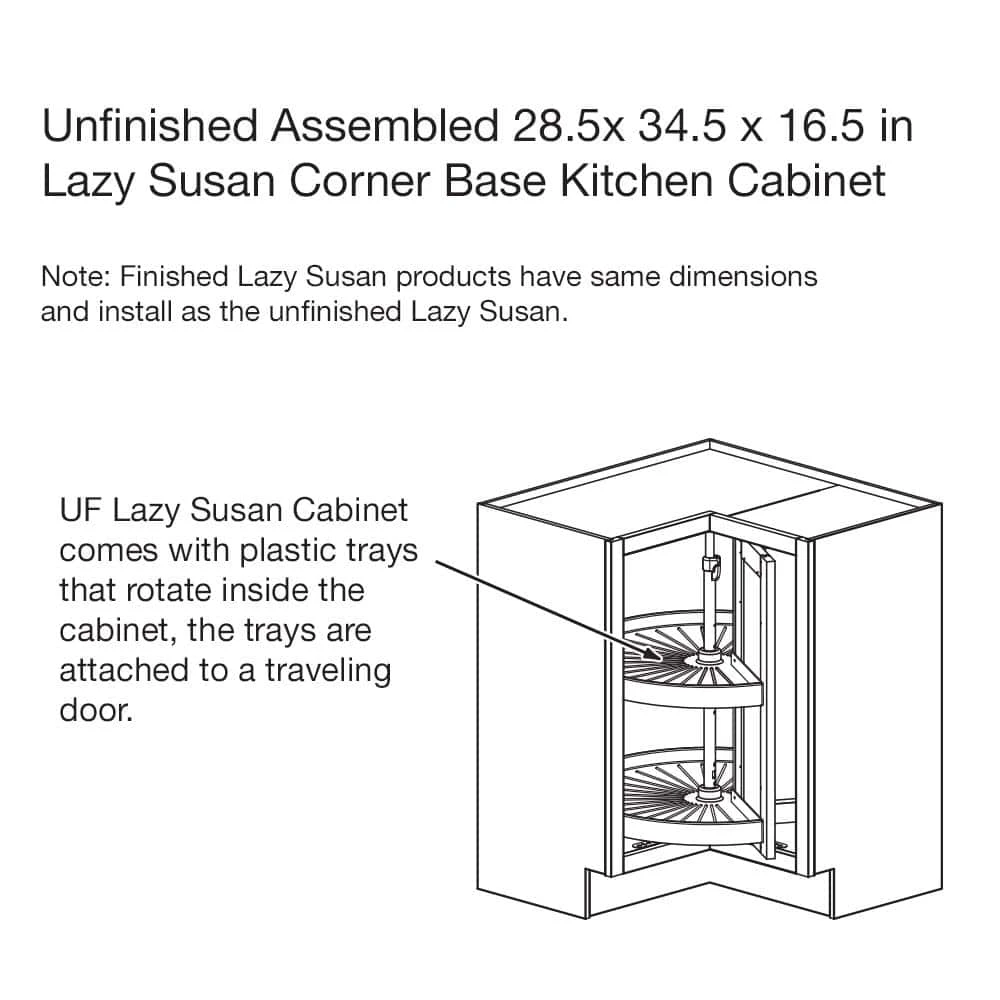 - Lazy susan cabinet is designed for use in a corner with base cabinets on each side, the required wall area is as shown in accompanying diagram- please see images for further details and installation instructions, once the face frames of the adjoining cabinets are in position, the sides of the lazy susan will not be visible