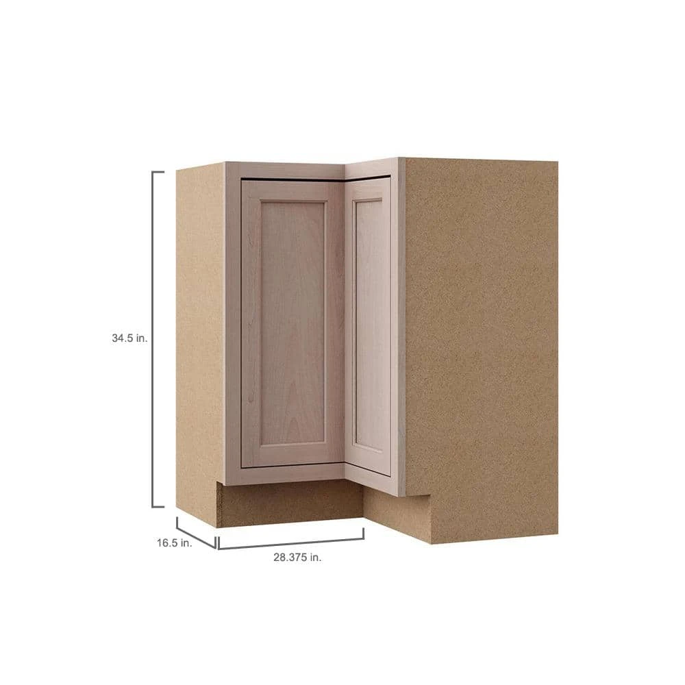 Simply push open the natural wood door of the 28 in. Lazy Susan Base Cabinet to access its 2 pie-cut shelves, which revolve to offer a wide range of storage options. The cabinet’s wood door and frame are ready for a coat of paint or stain, helping you create a look that complements your unique home design. The cabinet is pre-configured and fully assembled for your convenience.