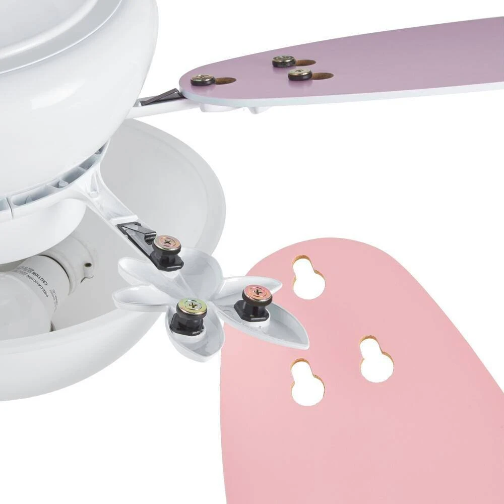 This smart home bundle pairs the Harper fan with the Universal Smart Wi-Fi 4-Speed Ceiling Fan Remote control, powered by Hubspace technology, to provide an easy way to integrate your fan and lights into your smart home system. The included Universal Smart Wi-Fi Remote control (shipped separately) converts your ceiling fan into a smart ceiling fan, by providing control access from anywhere via a smart device and an internet connection. Easily integrates with Google Assistant and Alexa. The Harper III 44 in. Ceiling Fan is perfect for a child’s room with its flower blade arms. The reversible purple/pink blades will provide a choice depending their favorite color. The bowl style light kit in frosted glass completes this juvenile fan.