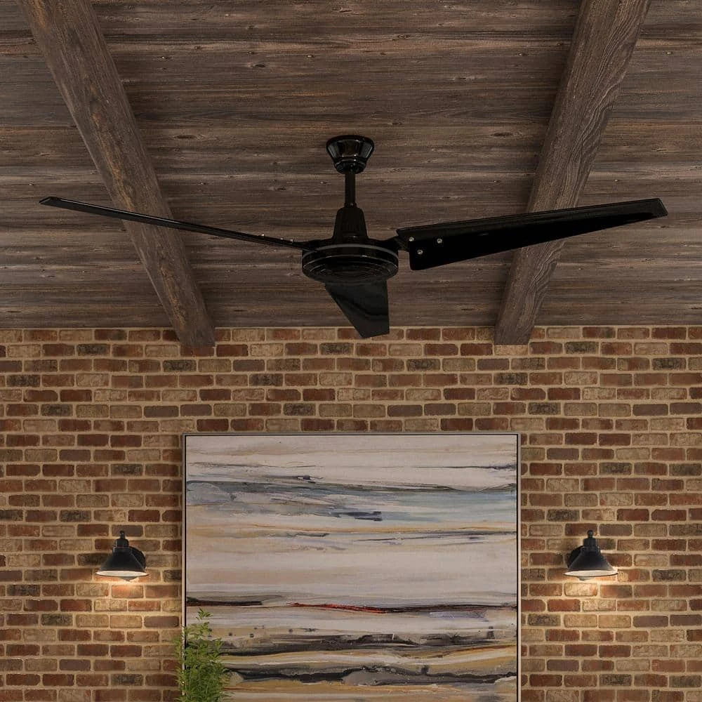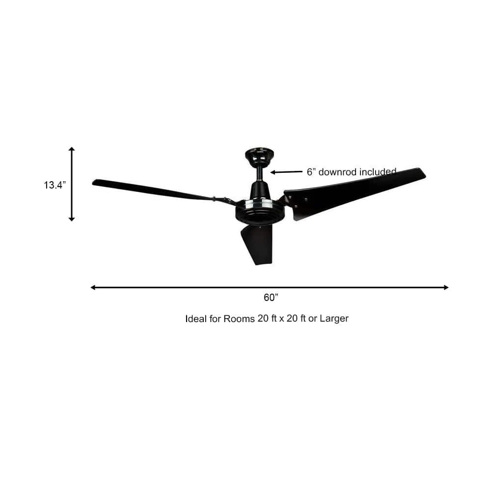 Built with an impressively powerful 194 RPM motor, the Hampton Bay Industrial 60 in. Black Ceiling Fan is ideally suited to industrial installations of 20 ft. x 20 ft. or larger. It delivers up to 9,999 CFM of maximum airflow, and an included wall-mount remote provides control for the fans four speeds. The contemporary styling and versatile black finish incorporate well into many decors, and its high-efficiency blade pitch allows greater air movement. This single-mount fan includes a 6 in. downrod for added convenience and ease of installation.