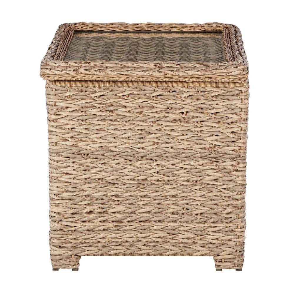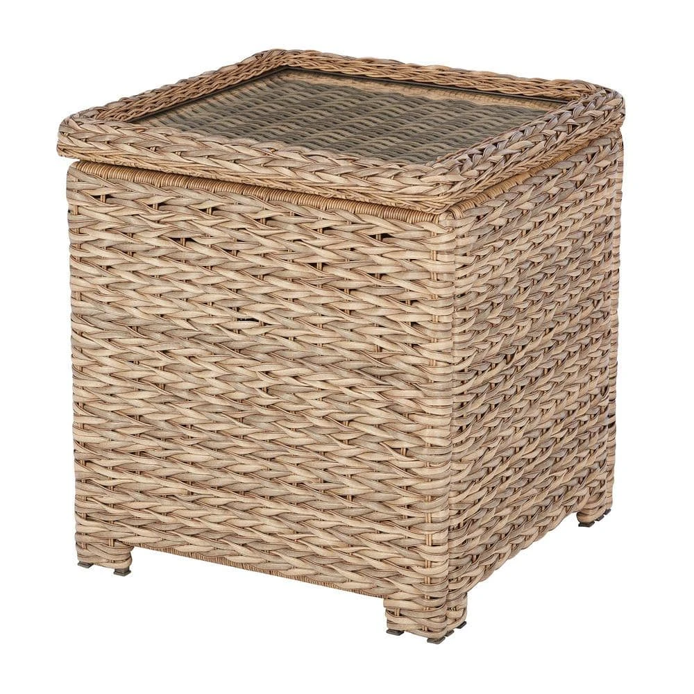 The hand-woven design of this outdoor side table pairs perfectly with your pool, porch or sunroom. Crafted with polyethylene resin strands and a powder-coated steel frame, this weather-resistant piece holds a drink, snack or book while you enjoy the season. It can support up to 50 lbs. and includes storage. Whether used as an accent or paired with other items from the Laguna Point Collection, this outdoor table infuses your space with sophisticated style.
