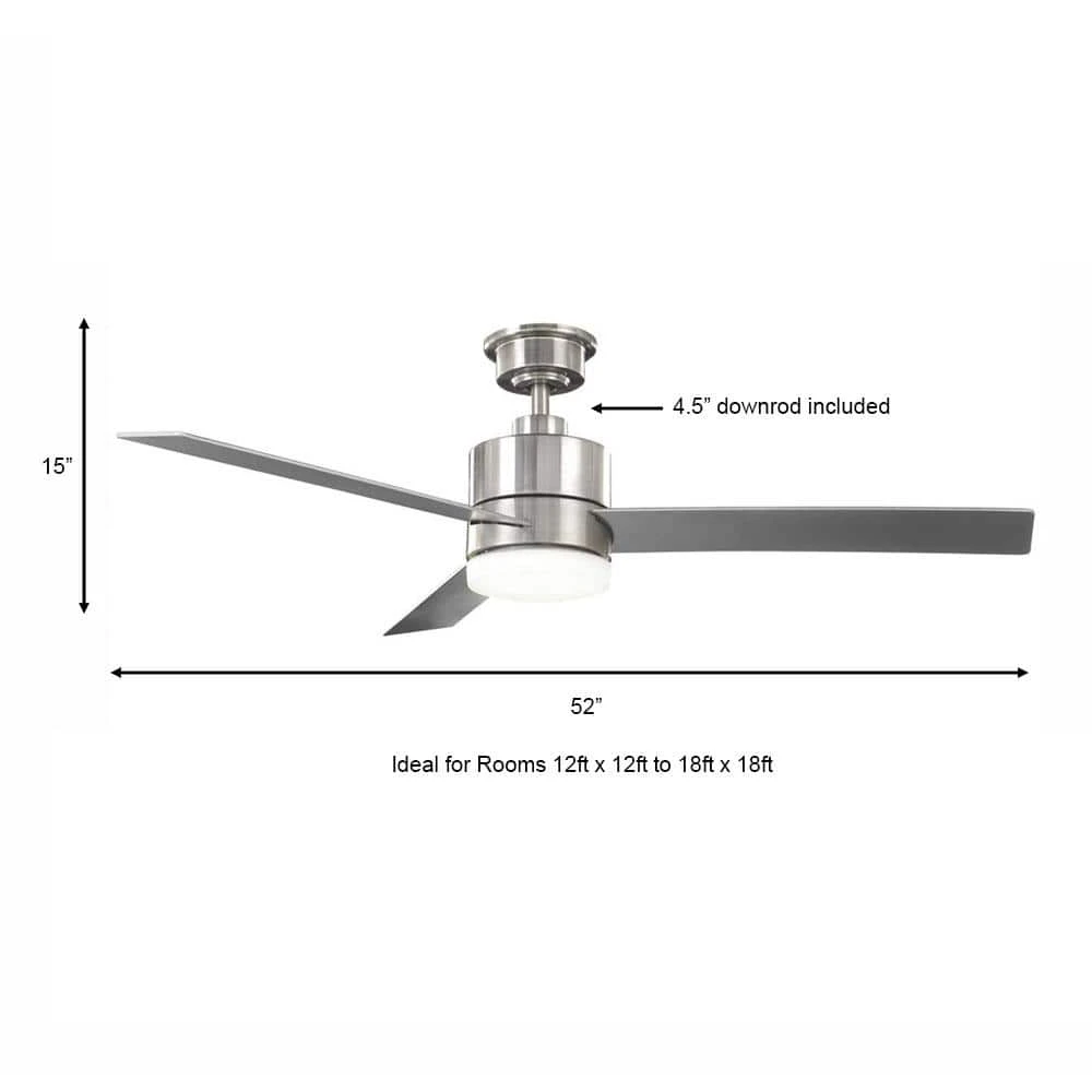 The Hampton Bay Madison 52 in. Brushed Nickel Ceiling Fan offers a modern 3-blade design. The integrated LED light kit offers versatile lighting options. Choose from 3,000K, 4,000K or 5,000K light output options all conveniently controlled with the included remote control.