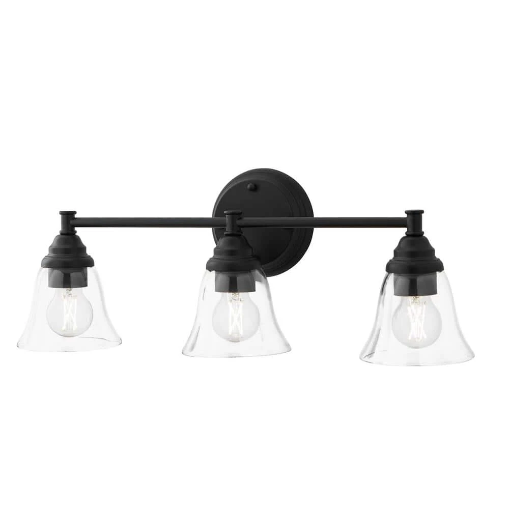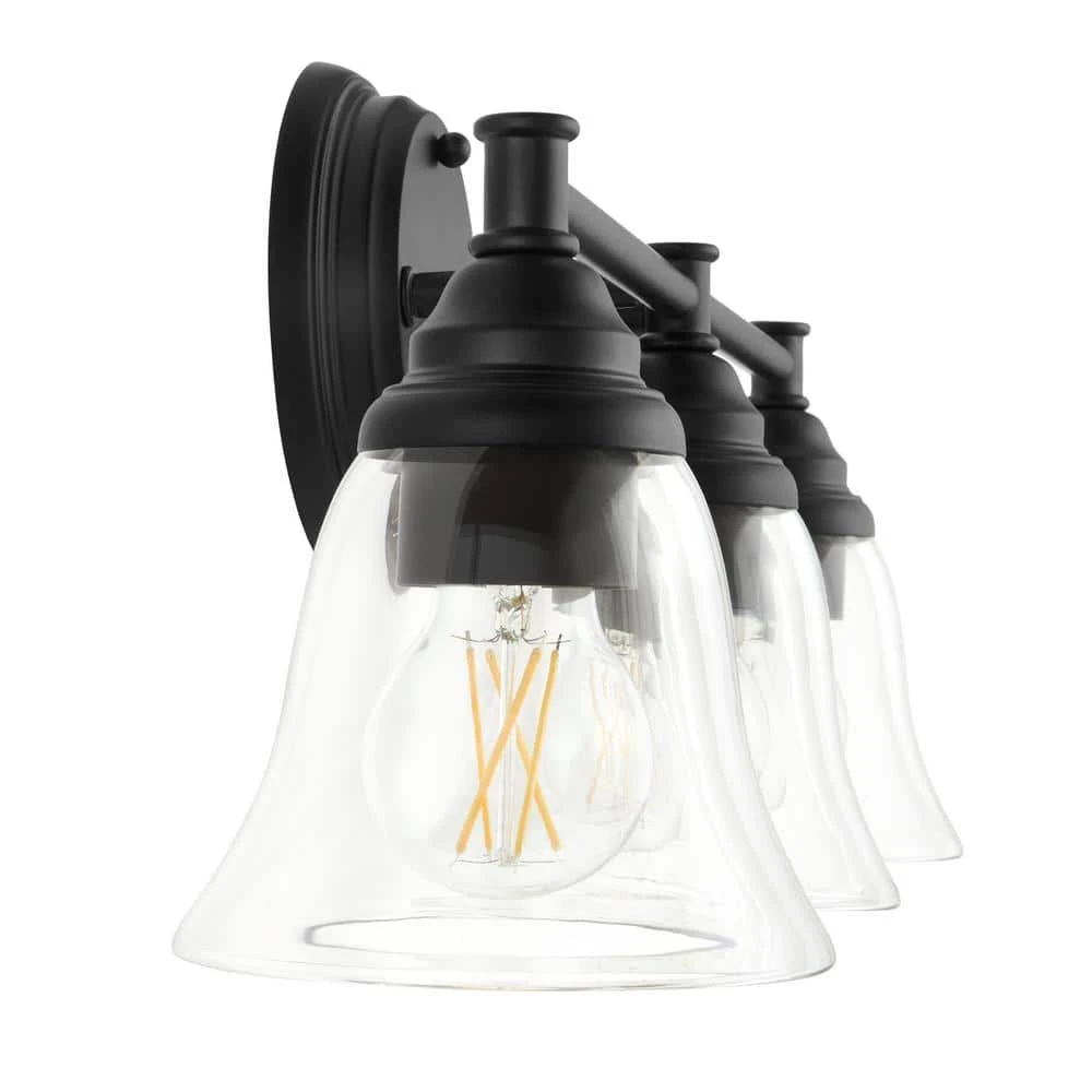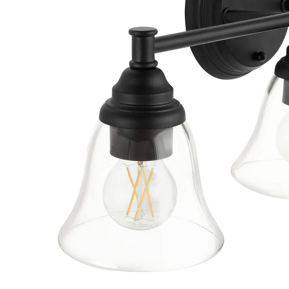 This Marsden vanity light fixture features a casual take on Transitional style with simple lines and a timeless look. These fixtures are built with a protective Matte Black Finish over steel construction to look great and last for-years to come. The clear glass shade adds style and a warm light, they install easily in the up or down position.