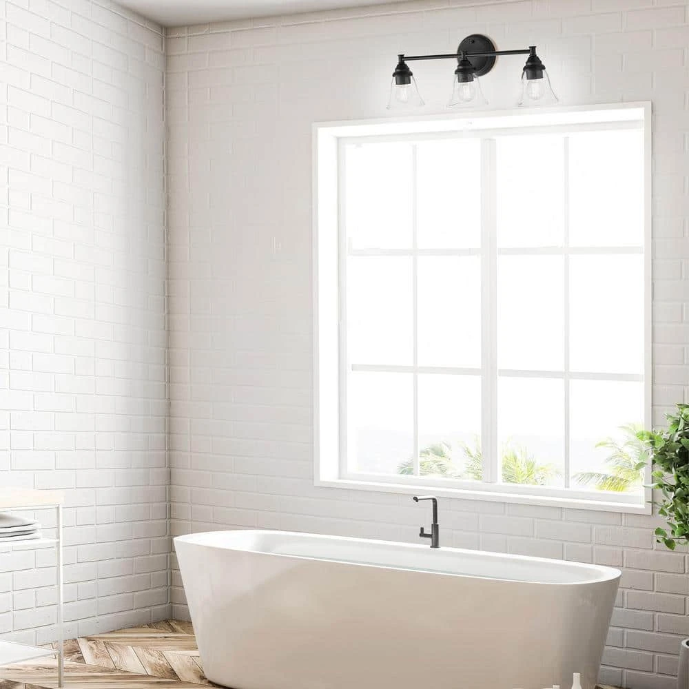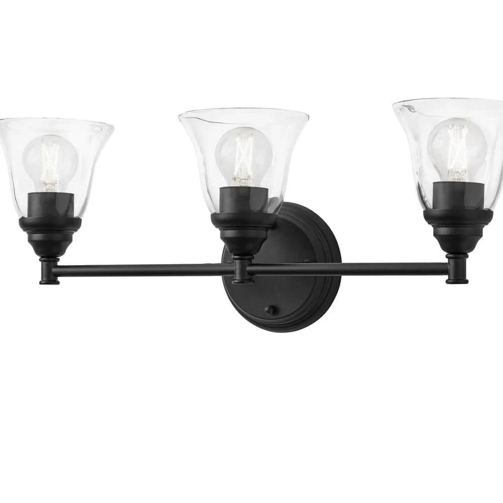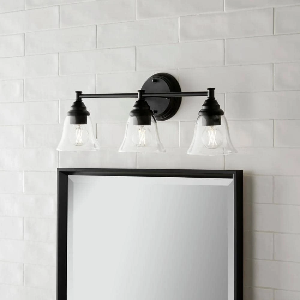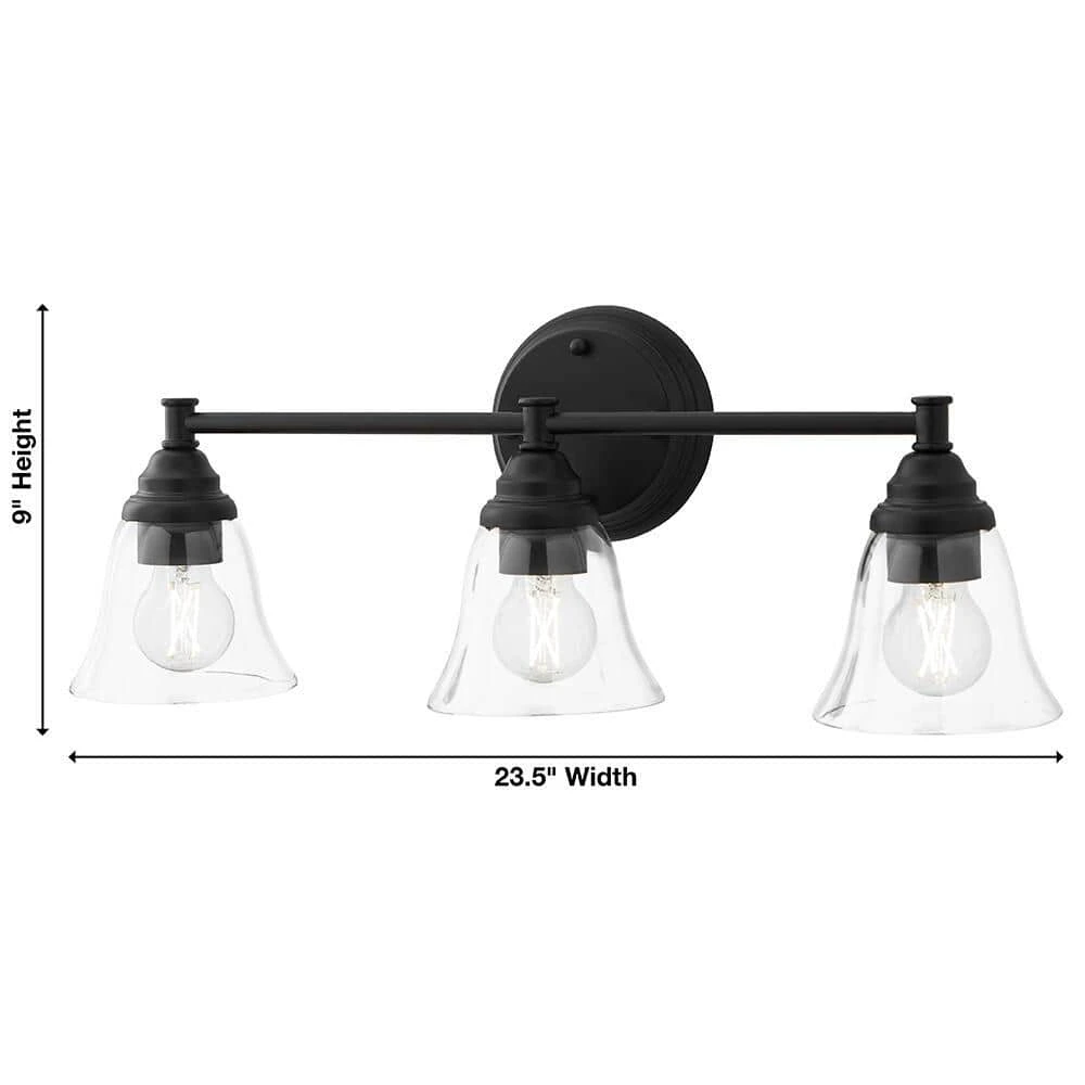 This Marsden vanity light fixture features a casual take on Transitional style with simple lines and a timeless look. These fixtures are built with a protective Matte Black Finish over steel construction to look great and last for-years to come. The clear glass shade adds style and a warm light, they install easily in the up or down position.