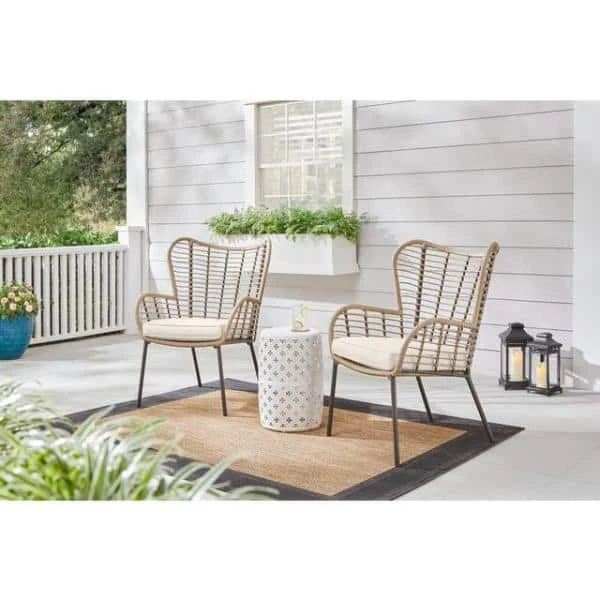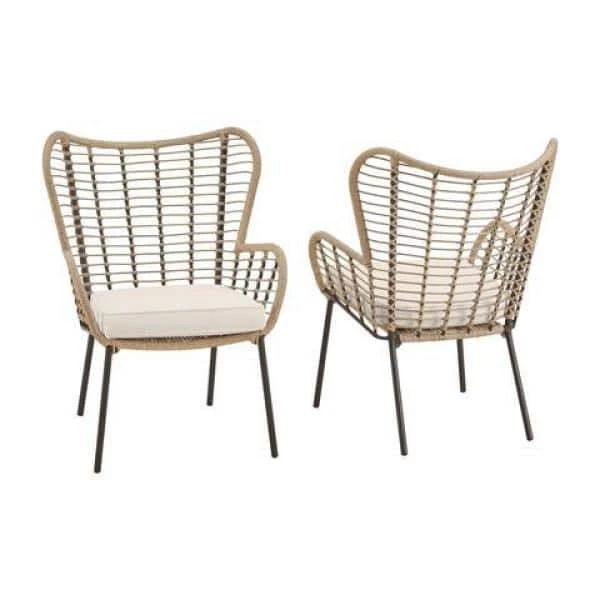 Give your outdoor seating area a cozy finishing touch with this set of two Hampton Bay Melrose Park lounge chairs. An open wicker weave adds timeless style to your patio or deck, and the plush cushions offer comfort for days spent relaxing in the sun. This pair features durable CushionGuard fabric to resist staining and fading for lasting beauty. Sturdy steel frames stand up to wear and tear. These Hampton Bay Melrose Park lounge chairs showcase an almond biscotti and brown color scheme, coordinating beautifully with a range of patio furnishings.