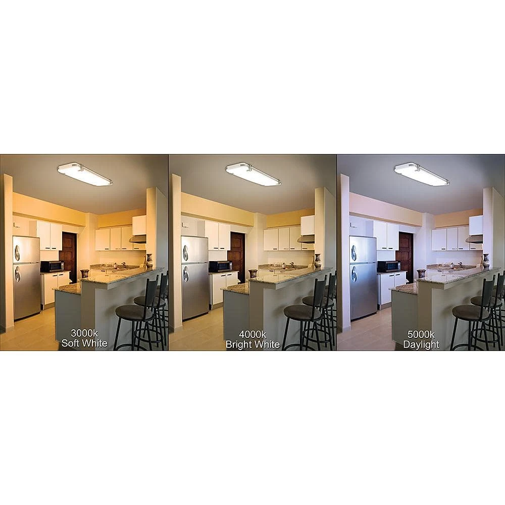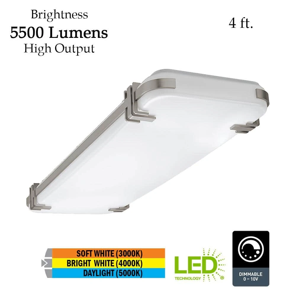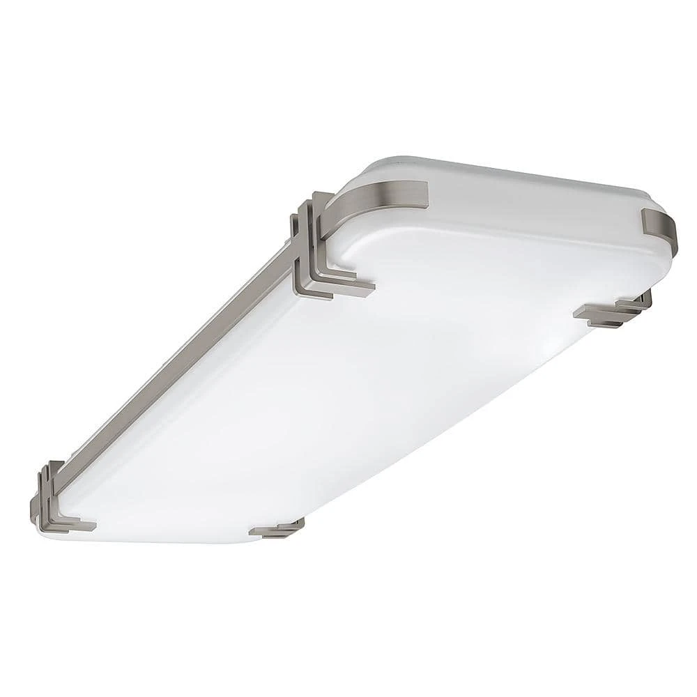 Mission is a style of furniture that originated in the late 19th century as a popular manifestation of the 20th Century arts and crafts movement. This style is best known for geometric lines and flat panels. Hampton Bay’s 4 ft. Rectangle LED Flush Mount Ceiling Light features a cross between Mission style and Industrial finish showcasing a simple Brushed Nickel border and vertical line accents. You choose between 3 color temperatures of light output: Soft White, Bright White or Daylight by using the toggle switch on the back of the fixture. It emits high output 5500 Lumens of brightness using only 75-Watt of electricity. The LED technology ensures long-lasting, energy-efficient service with no bulbs to replace for many years. Ideal for large kitchen, laundry room, garages, basements, hallways, dressing rooms, retail stores, waiting rooms or offices.