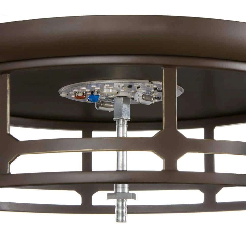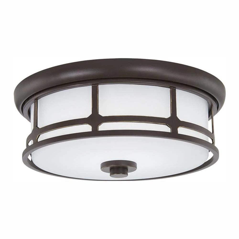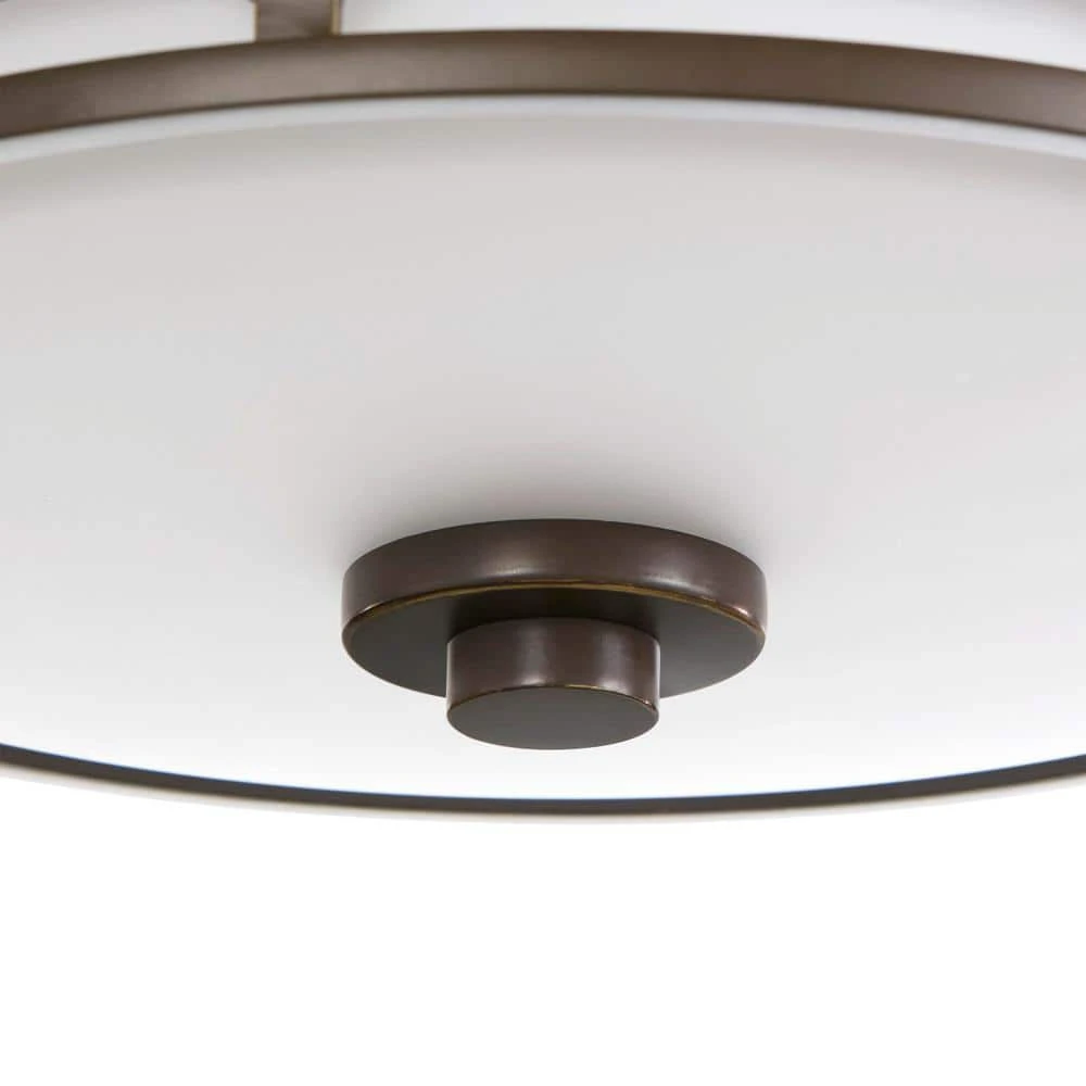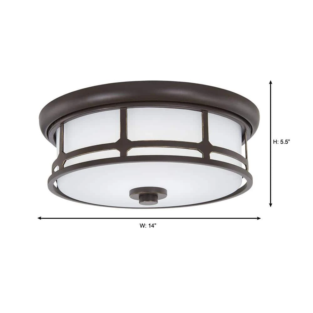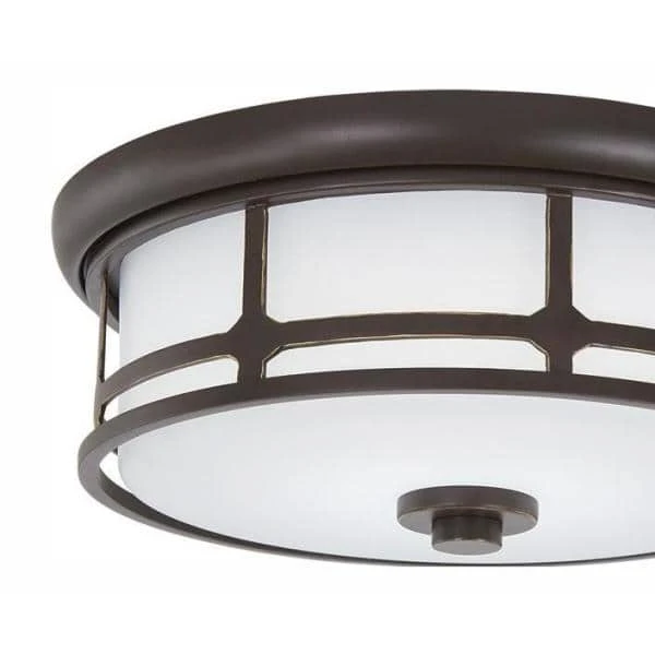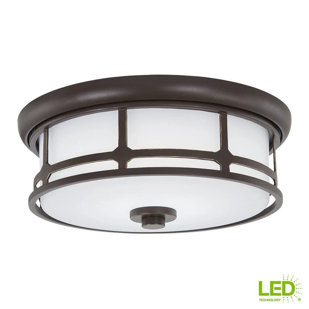 The Hampton Bay LED flush mount comes in an Oil Rubbed Bronze with Gold Highlights finish with etched white glass. This LED 14 in. flush mount brings a modern appearance with constructed clean lines to complement the decor in any room of your home. It uses integrated LED module and does not require ever having to replace light bulbs virtually eliminates maintenance.