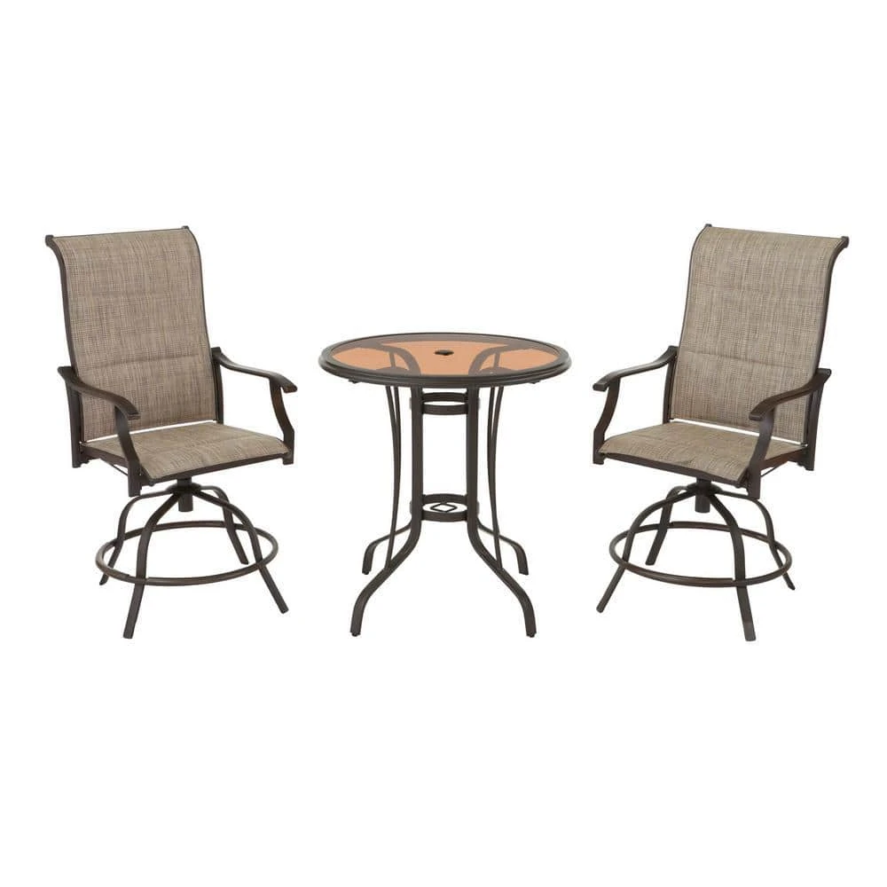 Add coastal flair to your outdoor space with the Riverbrook Espresso 3-Piece Brown Aluminum Round Outdoor Swivel Balcony Bistro Set. The perfect, stylish addition to your patio, deck or porch, it features powder-coated aluminum frames that are both rust and weather resistant .The coordinating sling fabric is UV resistant to help prevent fading. These stylish, swivel chairs have smooth motion, perfect for carefree lounging.