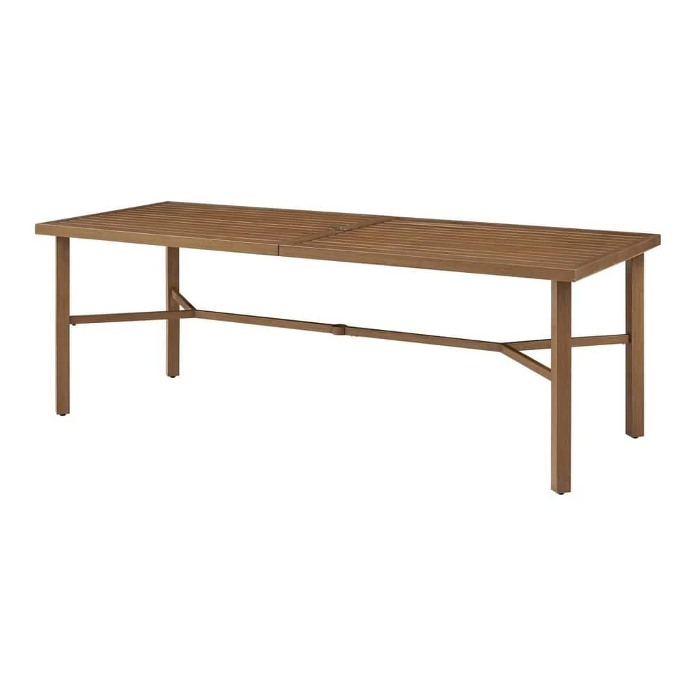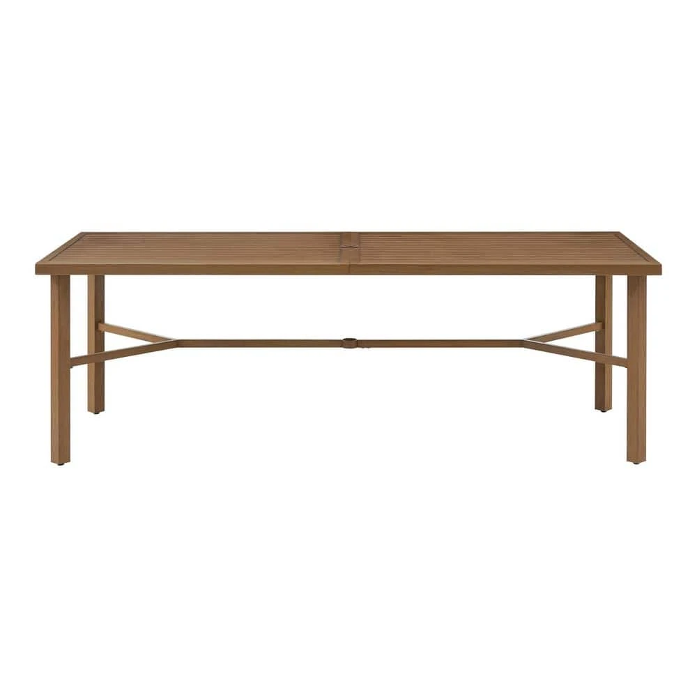 Elegance meets functional styling with the Rocky Mount collection. Oversized 84.25 in. slat top dining table provides ample seating for 8 or more. The table offers a beautiful hand applied wood grain finish in soft natural tones. The comfortable easy styling ensures you spend time enjoying time on the patio with the ones you love.