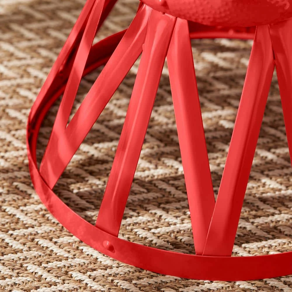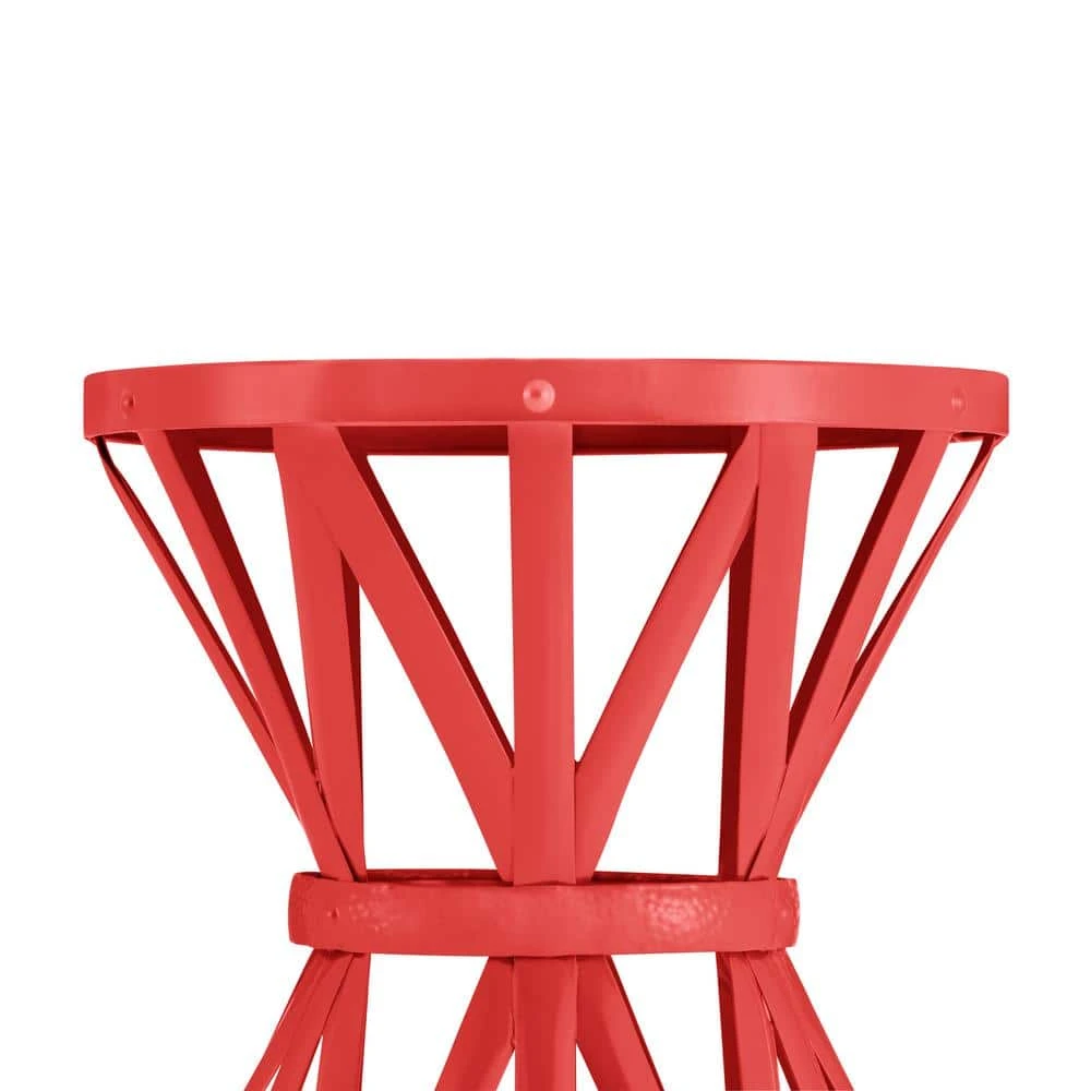 Set your patio or porch seating area with this Hampton Bay garden stool. The bright ruby red finish and unique geometric design creates a modern look to accent a sofa or love seat, and the durable steel construction stands up to outdoor use. A compact footprint makes this stool ideal for use as an end table. Use the round tabletop as a perch for plants or snack trays. It requires no assembly, making it easy to give your outdoor space a bold, contemporary accent.