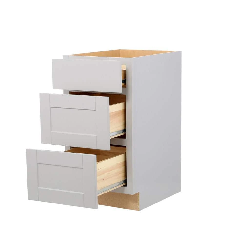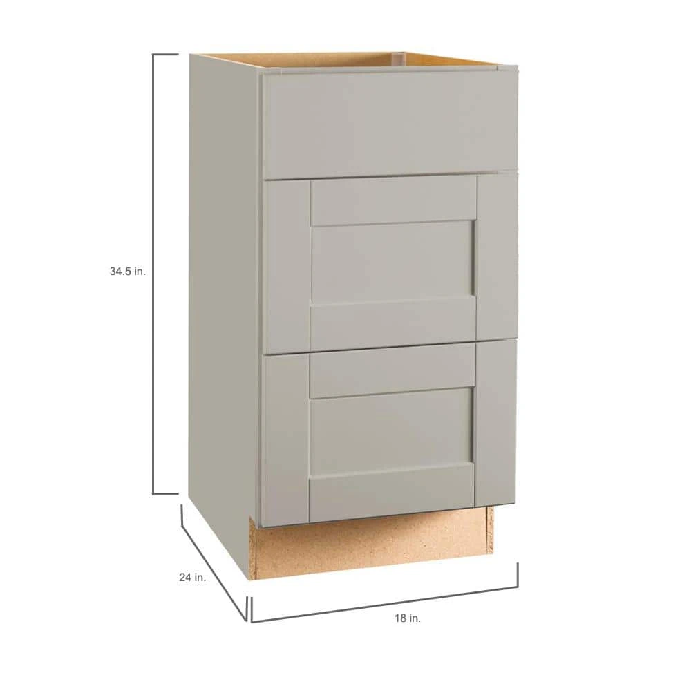 The furniture-quality finish on the Hampton Bay Drawer Base Cabinet adds warmth and beauty to your kitchen design. The cabinet has three 4-sided hardwood drawer boxes that open easily on smooth ball-bearing glides, giving you easy access to a convenient storage space. The cabinet is preassembled for hassle-free installation.