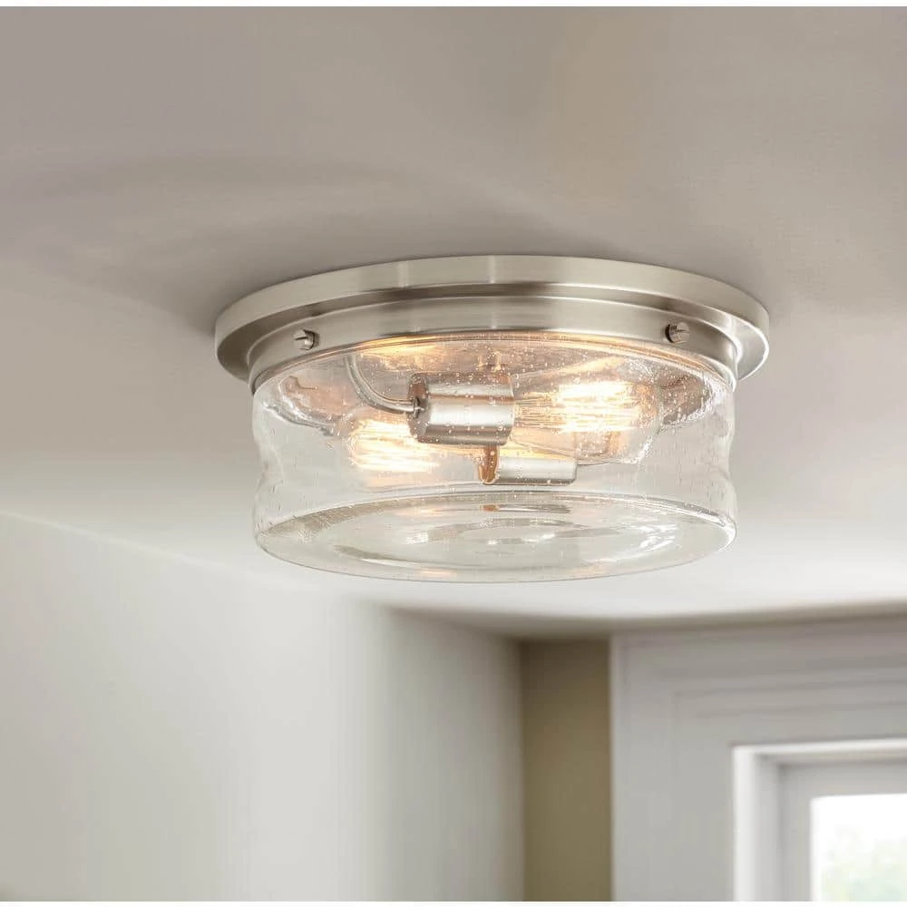 Bring back the look of a vintage light with this 2-light flush mount from the Hampton Bay Collection. Clear seeded glass houses Edison bulbs and a brushed nickel finish blends beautifully with any home decor. ETL Listed for damp locations, making it a stylish choice for entryways, hallways, kitchens and laundry rooms. Includes two 60-Watt vintage light bulbs.