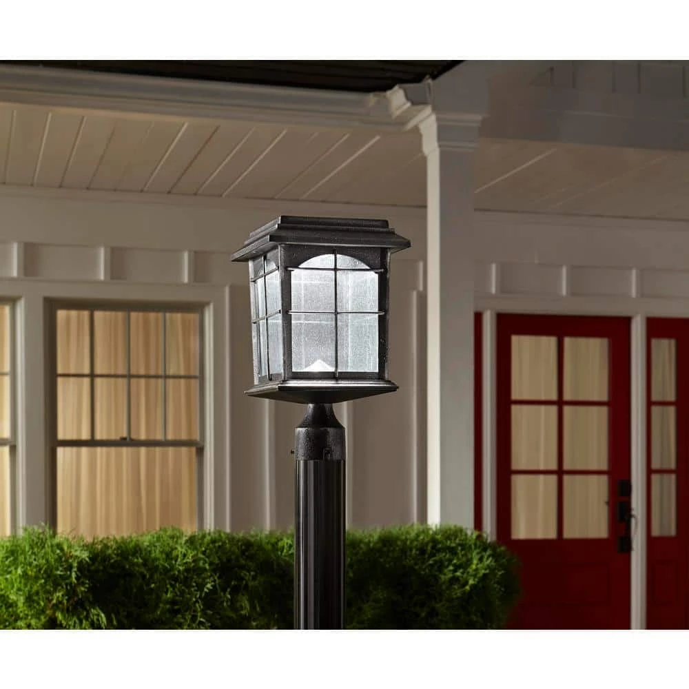 This Hampton Bay Solar Hand-Painted Outdoor Post Lantern with Seedy Glass Shade and 3000K warm white LEDs, creates an impressive addition to any home. Perfect for illuminating exterior walkways, patios and porches. At 139 Lumens, you’ll enjoy 10 hours of uninterrupted illumination. The aged-iron finish is applied to weather resistant aluminum construction for years of maintenance-free operation (no bulbs to replace!). Included with your LED deck light are all necessary hardware and battery(s).