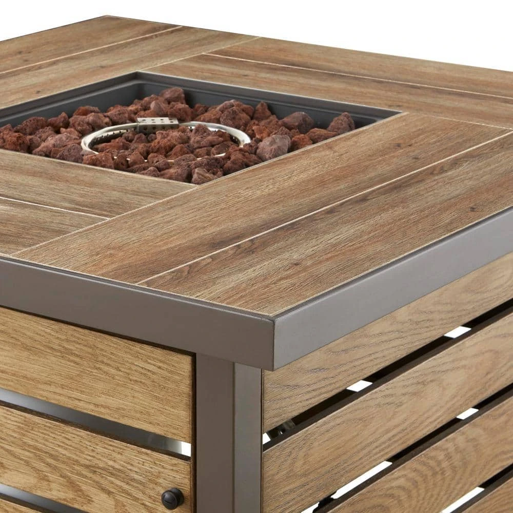 Add warmth, style and function to your outdoor space with this Summerfield gas fire pit. The wood-grain finish and brown steel frame of this farmhouse fire pit design match the finish and styling of select tables and chairs from the Home Depot Patio Mix and Match collection. Pair them together for a coordinated backyard design. With over 12 ½ inches of mantel on all four sides of the fire bowl, this 44 in. square gas fire pit offers plenty of tabletop space for dining and entertaining while gathered around the warm flames.