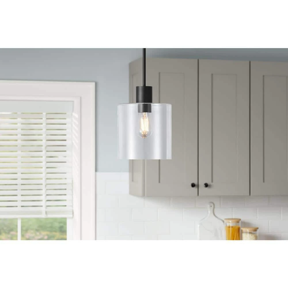 With a warm matte black finish, the Sutton Place Collection brings a refined modern farmhouse look to your home. The chic pendant light hangs from a black hanging bar that comes apart in four pieces so you can tailor it to fit any space. The clear glass shade showcases the bulb of your choice and provides a perfect finish to this gorgeous light.