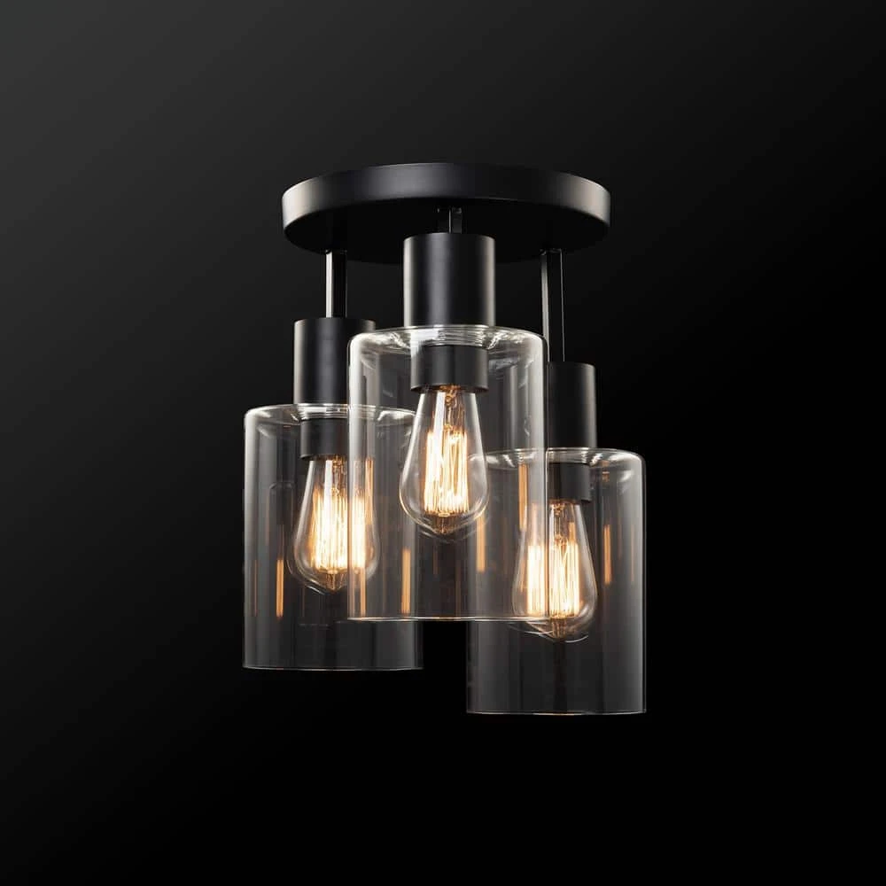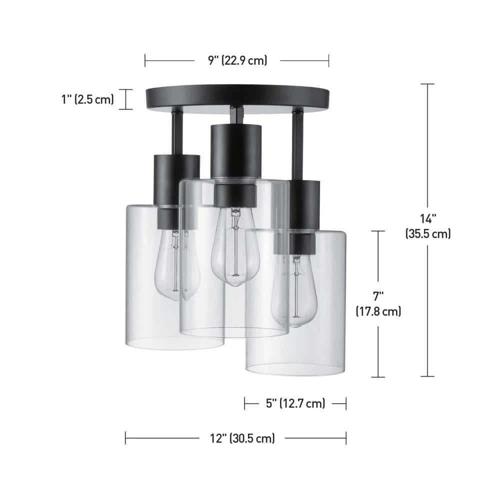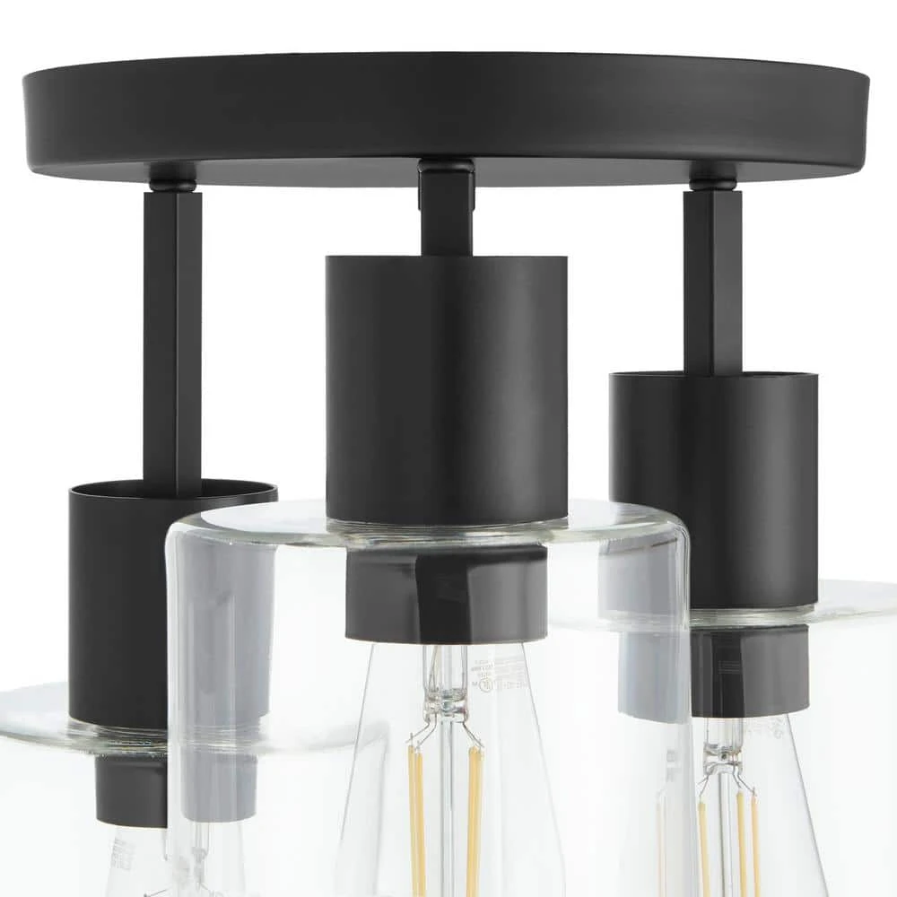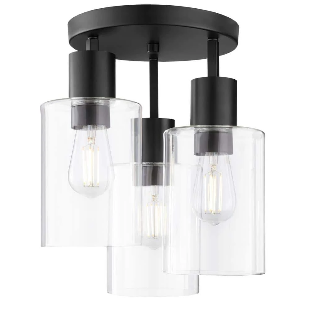 With a warm matte black finish, the Sutton Place Collection brings a refined modern farmhouse look to your home. The chic rectangular hanging bar accent contrasts the round canopy and oval sockets to create stunning visual appeal. Clear glass shades showcase the bulb of your choice and provide a perfect finish to a gorgeous 3-light flush mount.