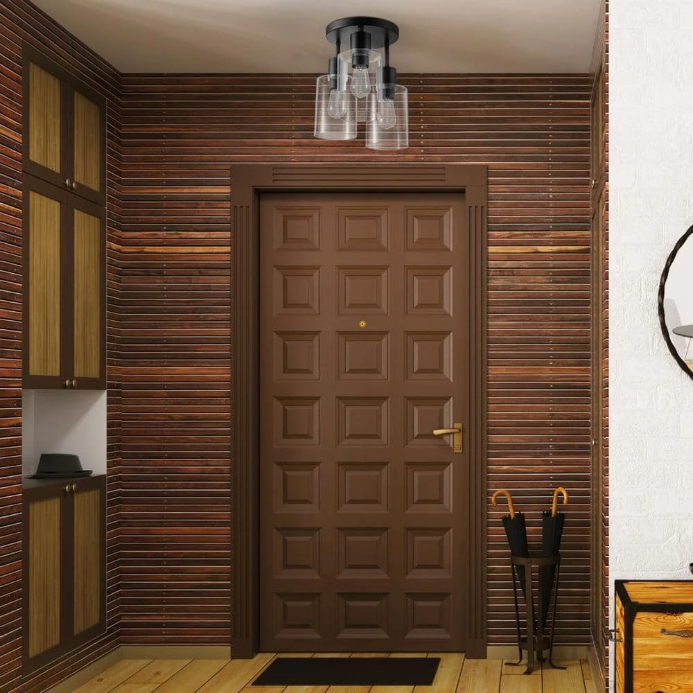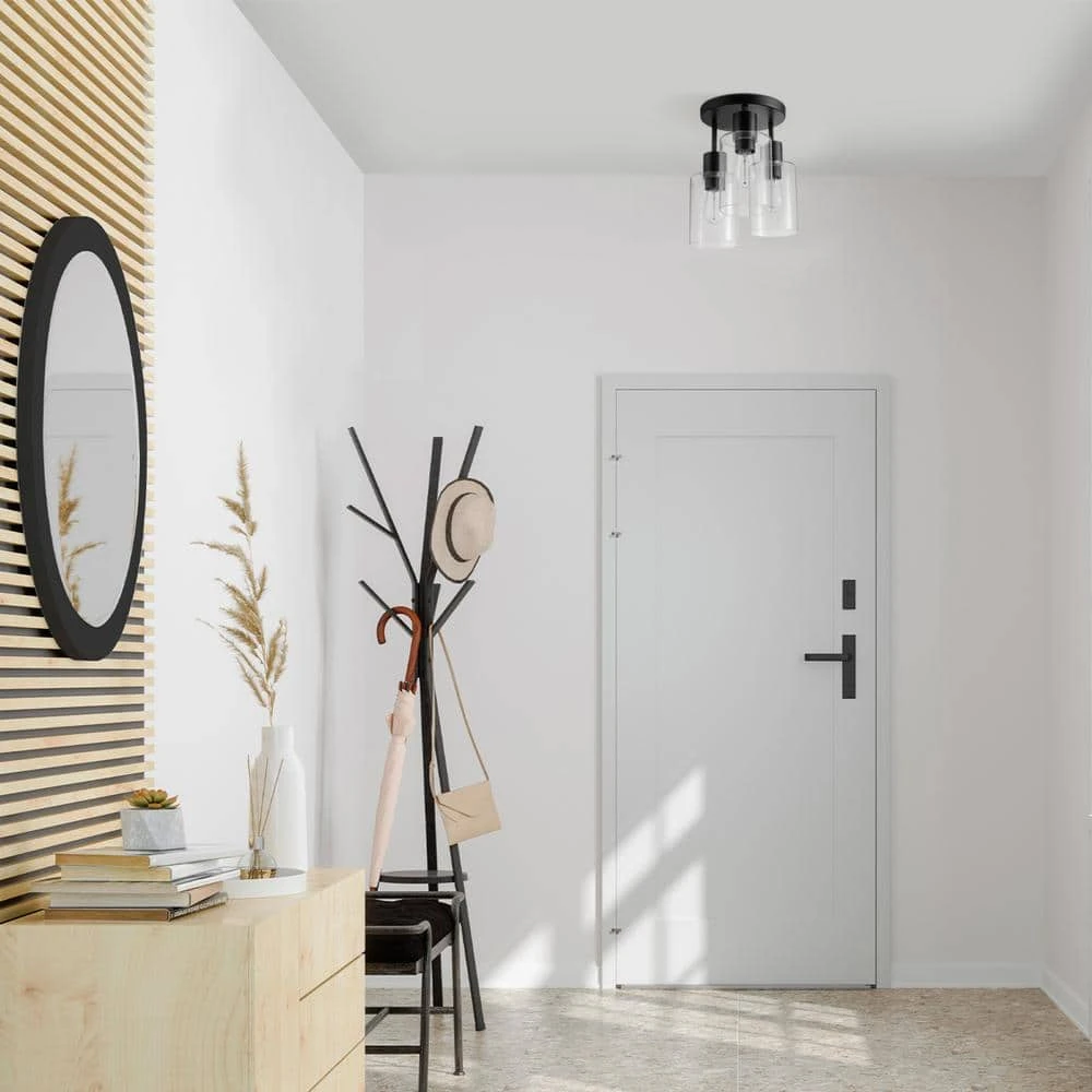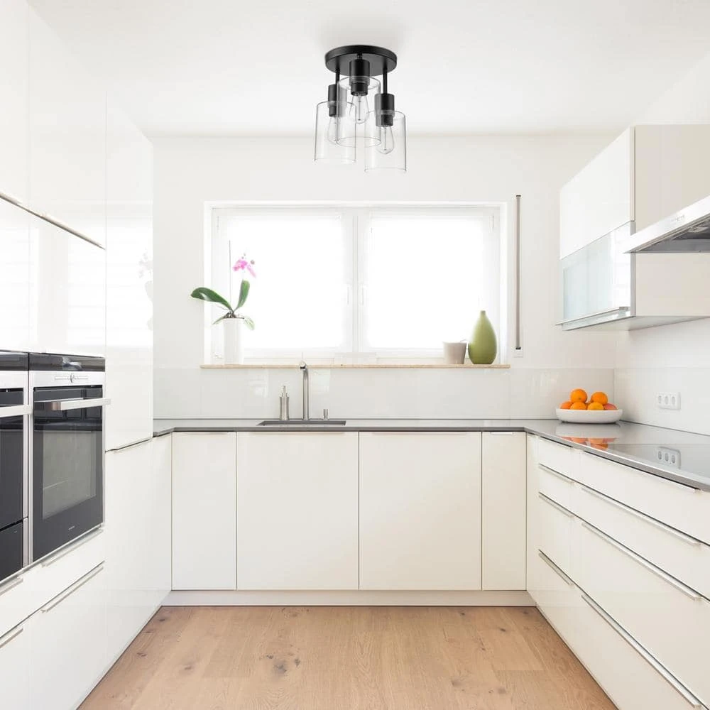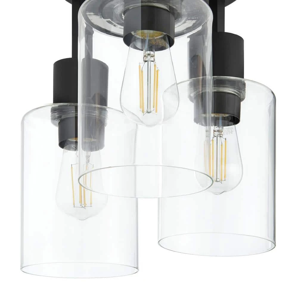 With a warm matte black finish, the Sutton Place Collection brings a refined modern farmhouse look to your home. The chic rectangular hanging bar accent contrasts the round canopy and oval sockets to create stunning visual appeal. Clear glass shades showcase the bulb of your choice and provide a perfect finish to a gorgeous 3-light flush mount.