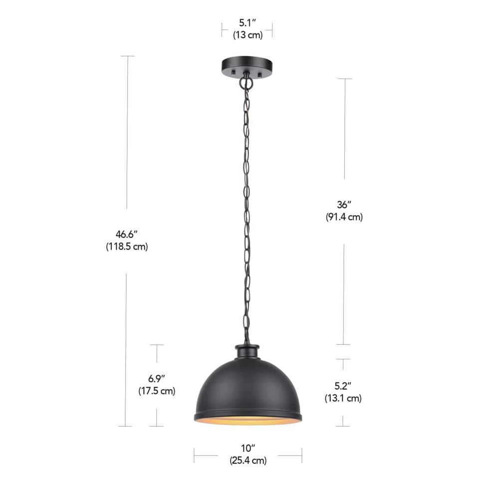 With a trendy matte black aluminum shade finished with a matte gold interior, this pendant light is perfect for bringing a turn-of-the-century industrial or sleek modern look to any area. The fully adjustable hanging chain allows you to customize the fixture to your specific needs and looks great above a dining room table or hung as a pair above a kitchen island. This modern industrial light features a sleek dome design for the shade that places it firmly in a timeless contemporary style. The classic black hanging cord, chain, canopy, and shade accent your minimalist industrial decor.