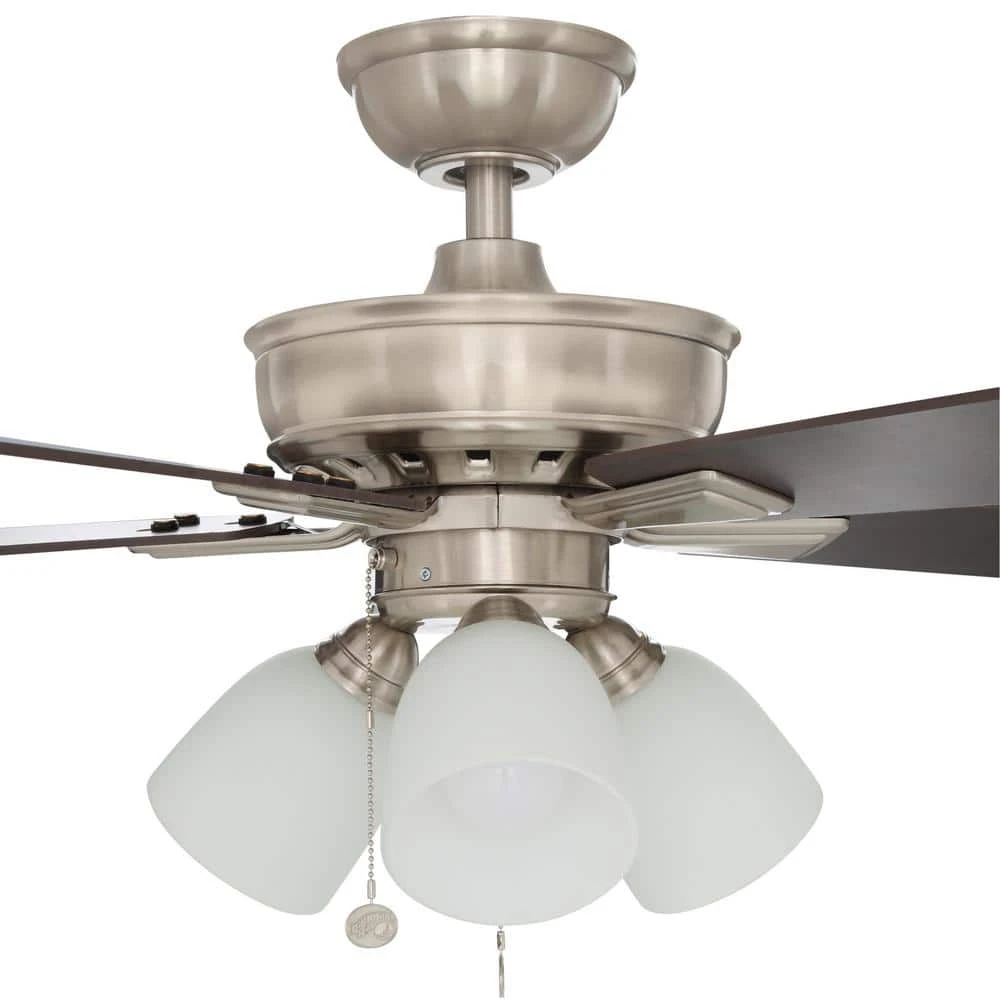 The 44 in. Vaurgas ceiling fan by Hampton Bay offers traditional elegance with modern design touches and technological advancements. This indoor ceiling fan includes QuickFit installation features like a slide-on mounting bracket and QuickInstall blades to make installation a breeze. This fan also includes 5-reversible blades to compliment many indoor decor trends. The 3-light light kit includes LED bulbs for increased energy efficiency.
