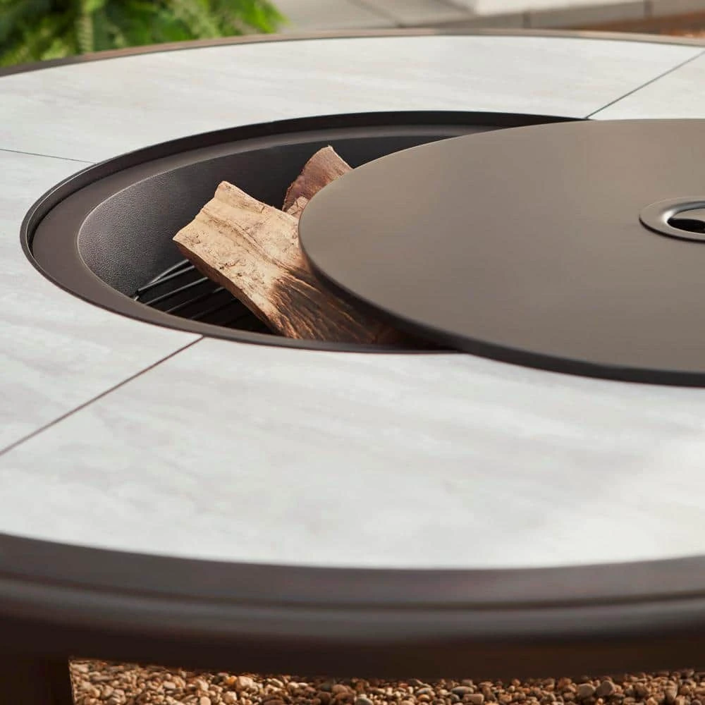 - Included fire bowl lid with flush handle allows fire pit area to be used as a table
