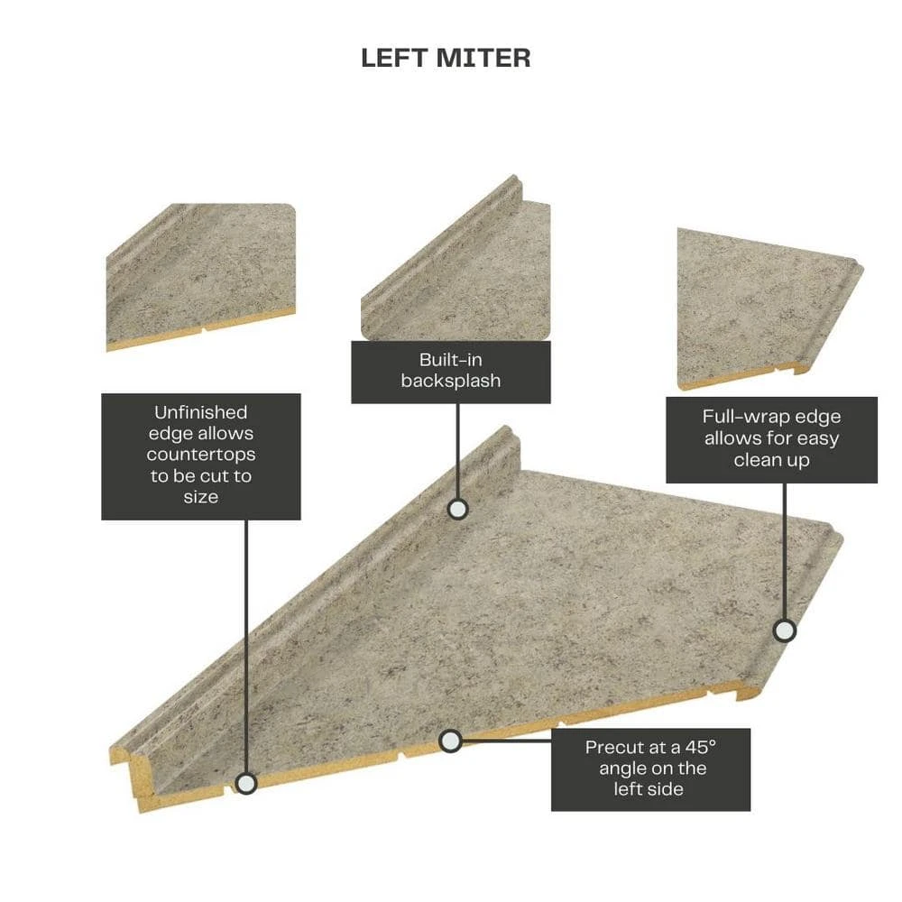Hampton Bay 10 ft. Laminate Countertop with Left Miter is designed to make countertop turn a corner when walls are at right angles. It has 3 in. integrated backsplash to protect your wall from spills and stains. The durable laminate surface is resistant to stain, scratch, scuffs and abrasion. This countertop comes ready to install and does not require polishing or buffing. It is ideal for use in places like kitchen, laundry room, utility room and more.