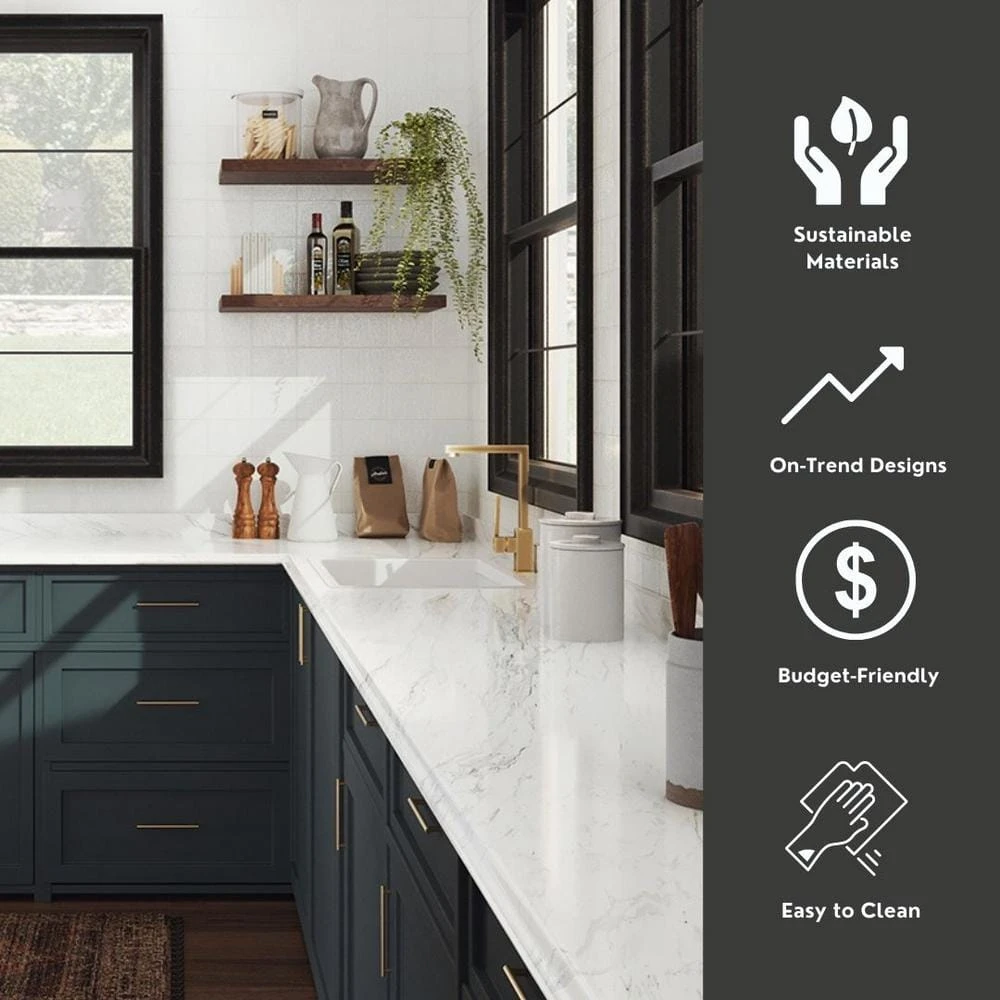 Enhance the look of any space with the sophistication and dramatic design of the Hampton Bay 8 ft. Laminate Countertop Kit in Calcutta Marble with Left Miter and Valencia Edge. This all-in-one kit includes a 3 in. loose backsplash, (1) endcap kit, (1) build-up kit and (1) miter bolt kit. The Valencia at-home kit is perfect for the DIY home owner and includes everything you need to add style to any space. The full wrap ogee edge provides a unique, contoured slope for a pleasant appearance.