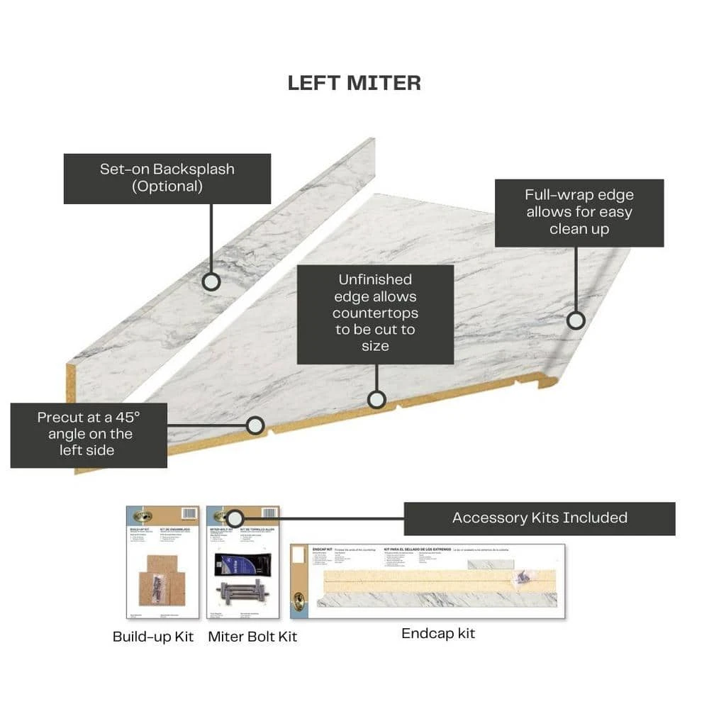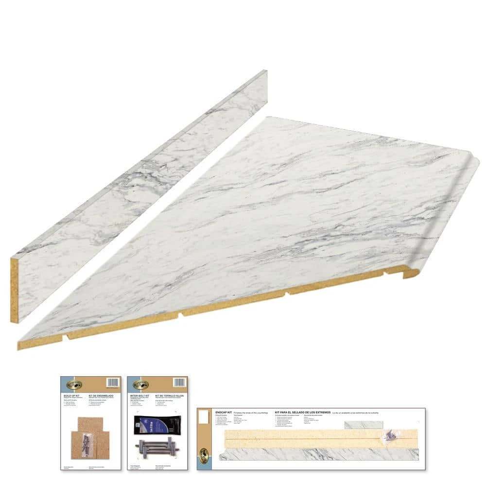 - Kit includes one 8 ft. laminate countertop in Calcutta Marble with left miter and Valencia edge, one 3 in. loose backsplash, 1 endcap kit, 1 build-up kit and 1 miter bolt kit